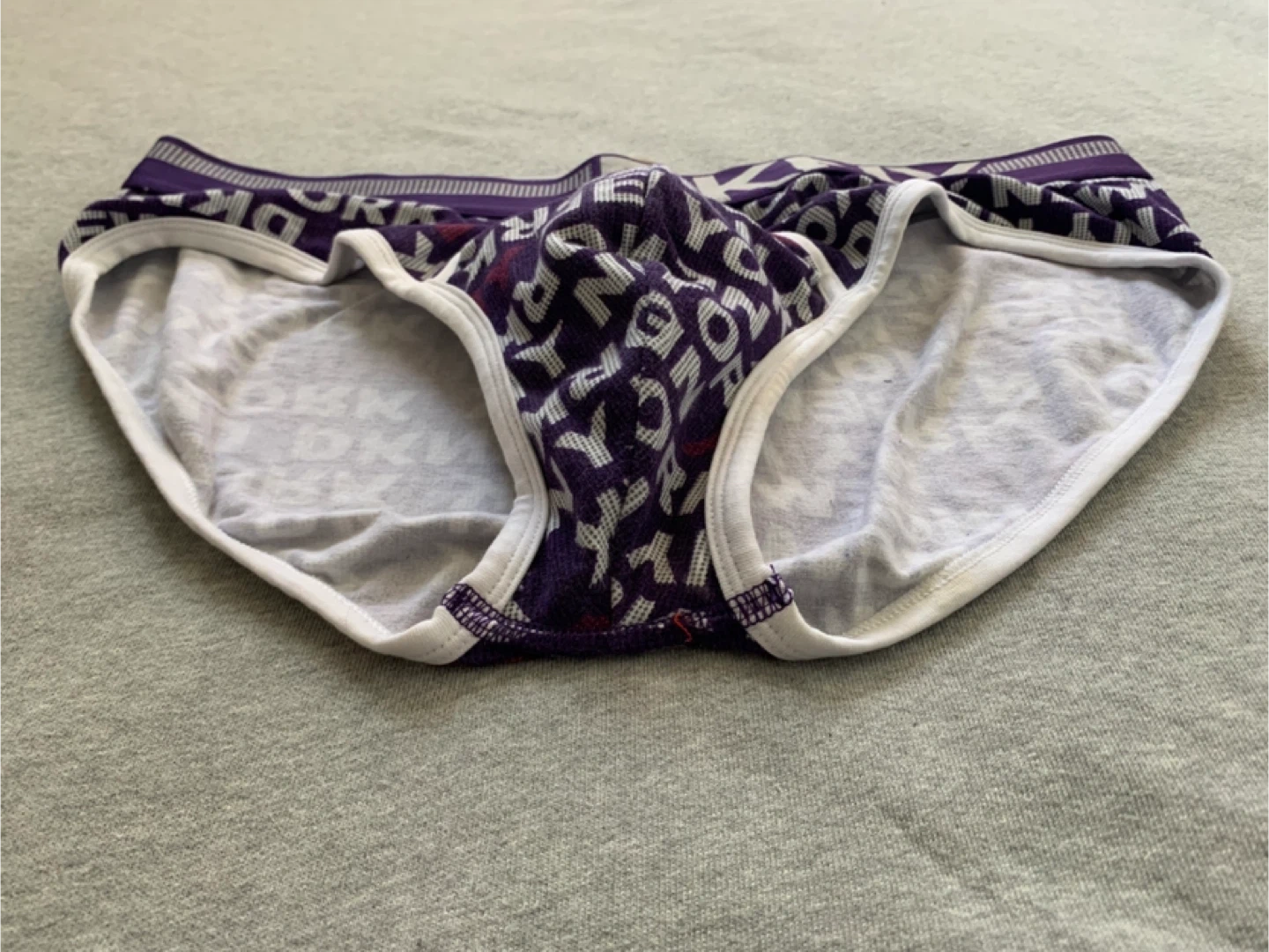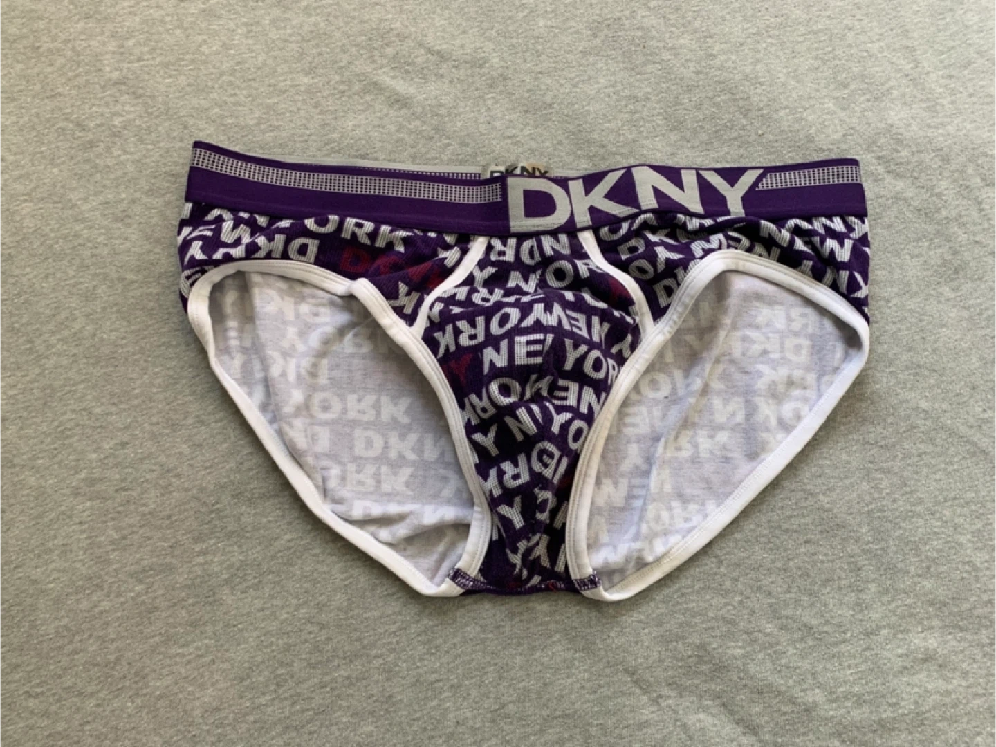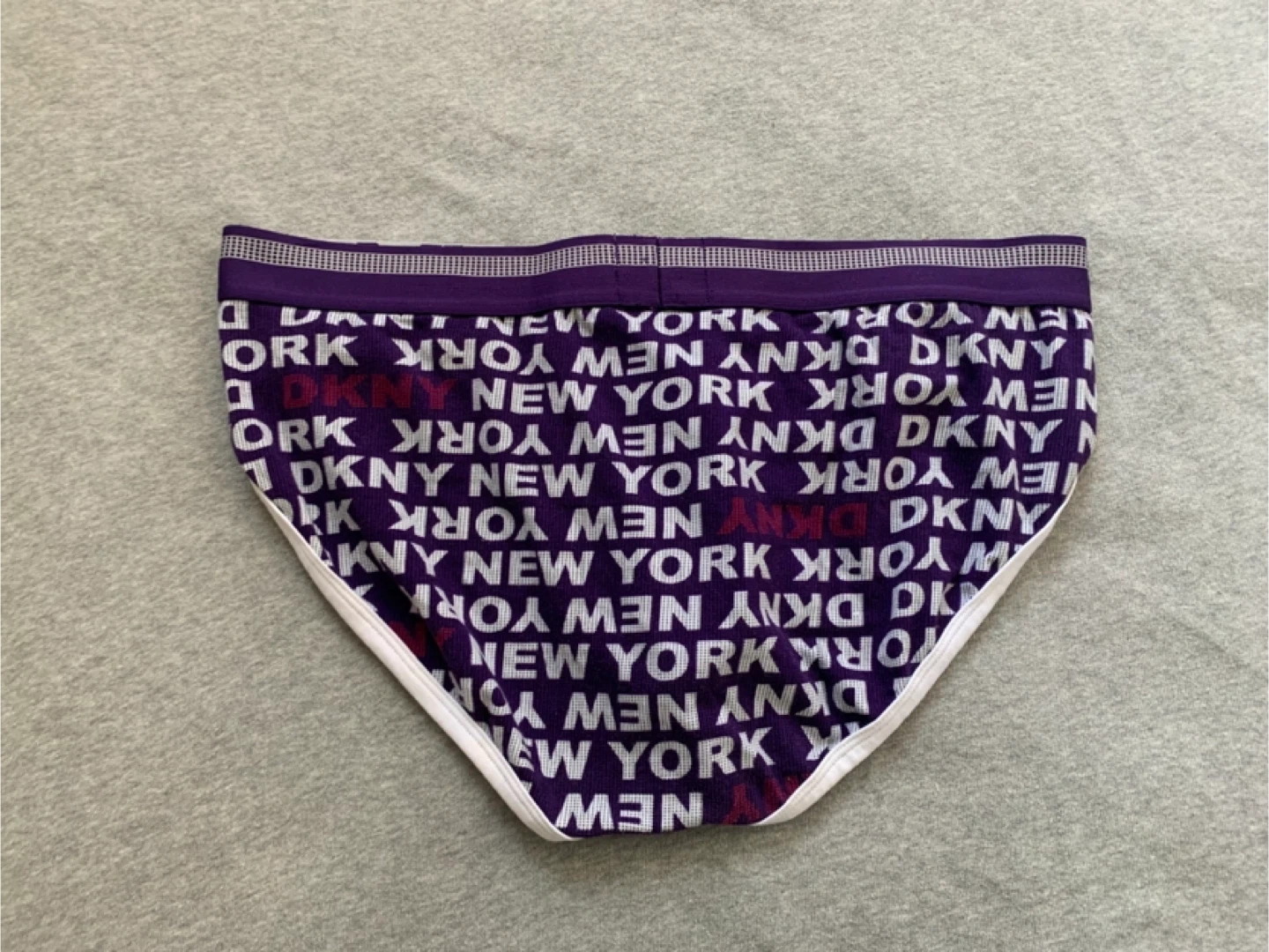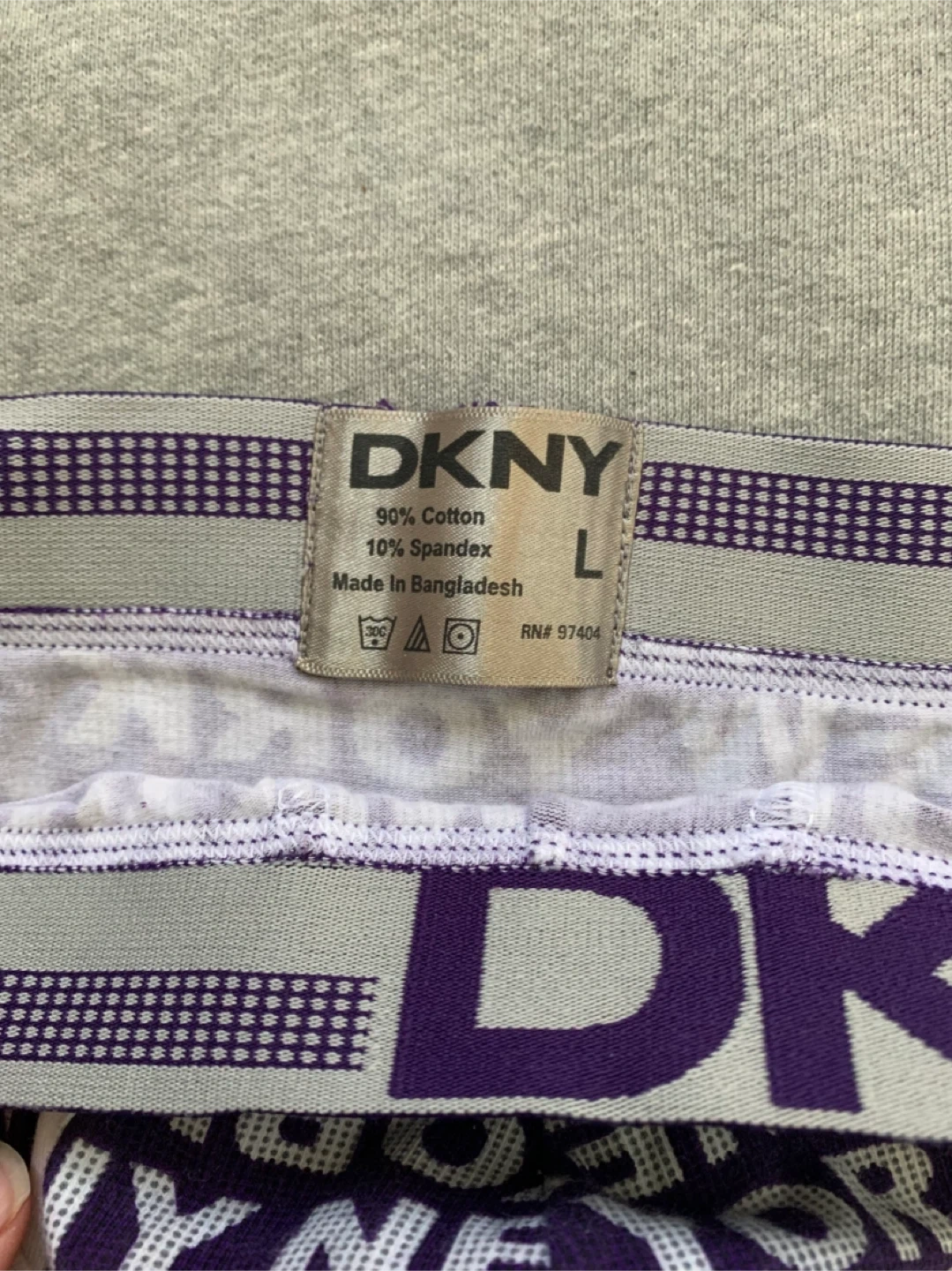 Purple with a white trim and have the words "DKNY NEW YORK" printed all over them