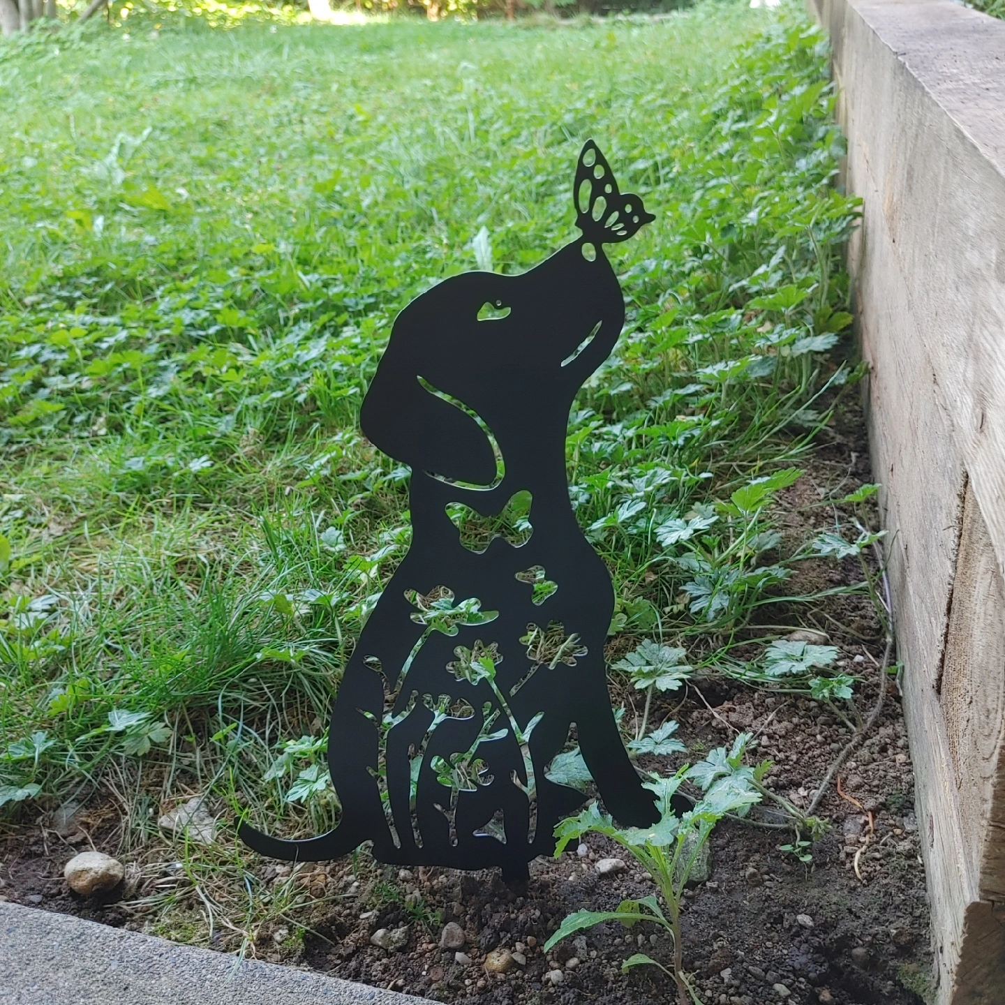 Add a whimsical touch to your garden with this metal dog garden stake! It features a cute dog silhouette with a butterfly on its nose and flower cutouts. Perfect for adding some charm to your flower beds or lawn Almost new