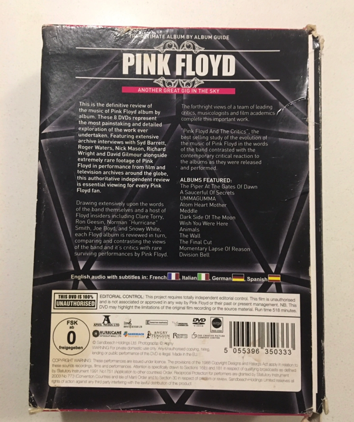 Relive the magic of Pink Floyd with this DVD set, "Another Great Gig in the Sky". This collection offers an in-depth exploration of their music and history. The DVDs are in good condition, however Disc One is missing, ready to transport you back to the iconic era of one of rock's greatest bands. This is a definitive review of the music of Pink Floyd album by album. These 7 DVDs represent the most painstaking and detailed exploration of the works undertaken. Featuring extensive archive interviews with Syd Barrett, Roger Waters, Nick Mason, Richard Wright and David Gilmour alongside extremely rare footage of Pink Floyd in performance from film and television archives around the globe, this authoritative independent review is essential viewing for any fan! Looking to add a bit of rock history to your collection? You've found it! If the ad is still up, the DVD set is available, so don't miss out!