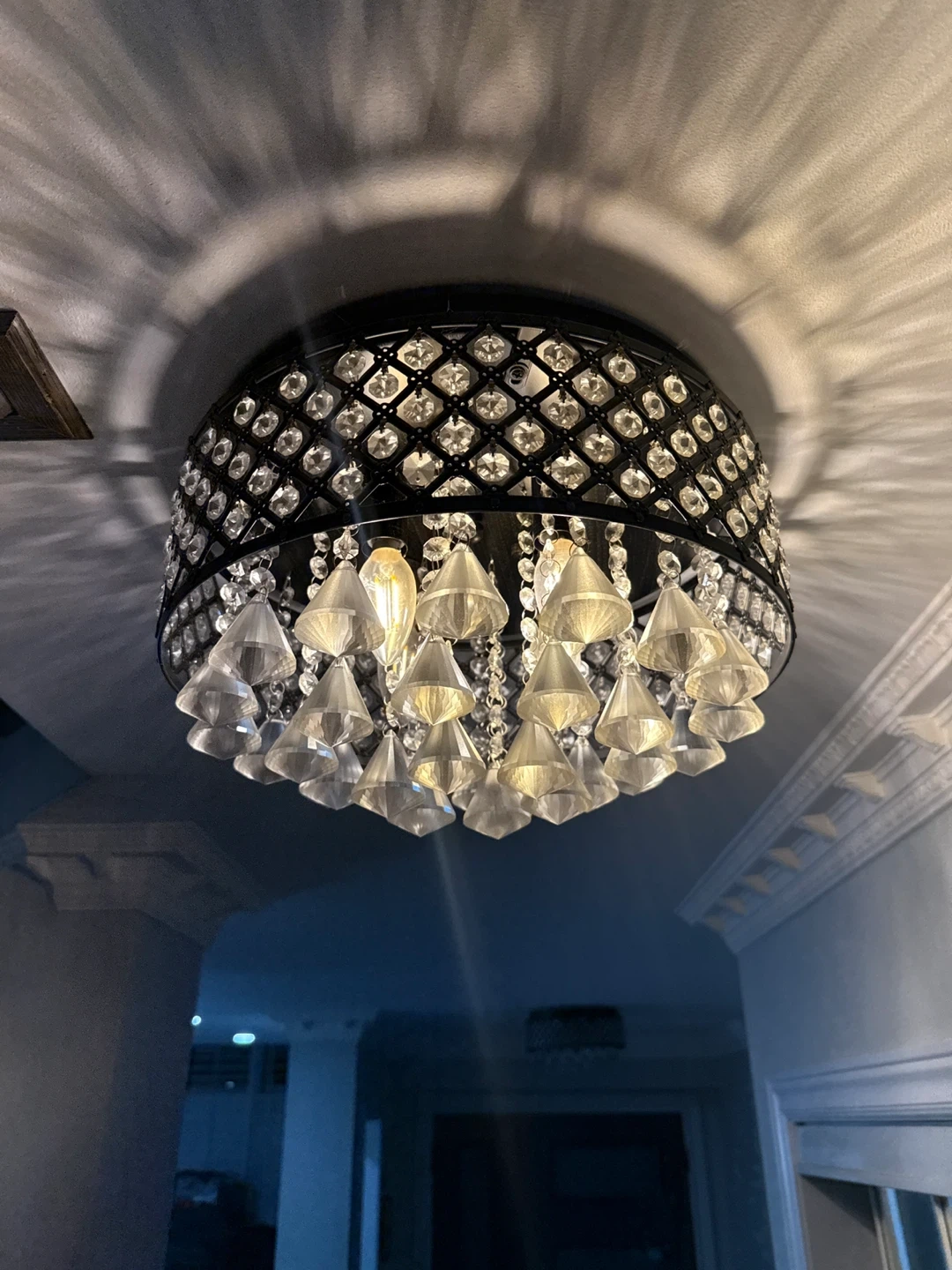 Selling a beautiful crystal chandelier! It features a black frame with a diamond pattern and clear crystal pendants. It would add a touch of elegance to any room