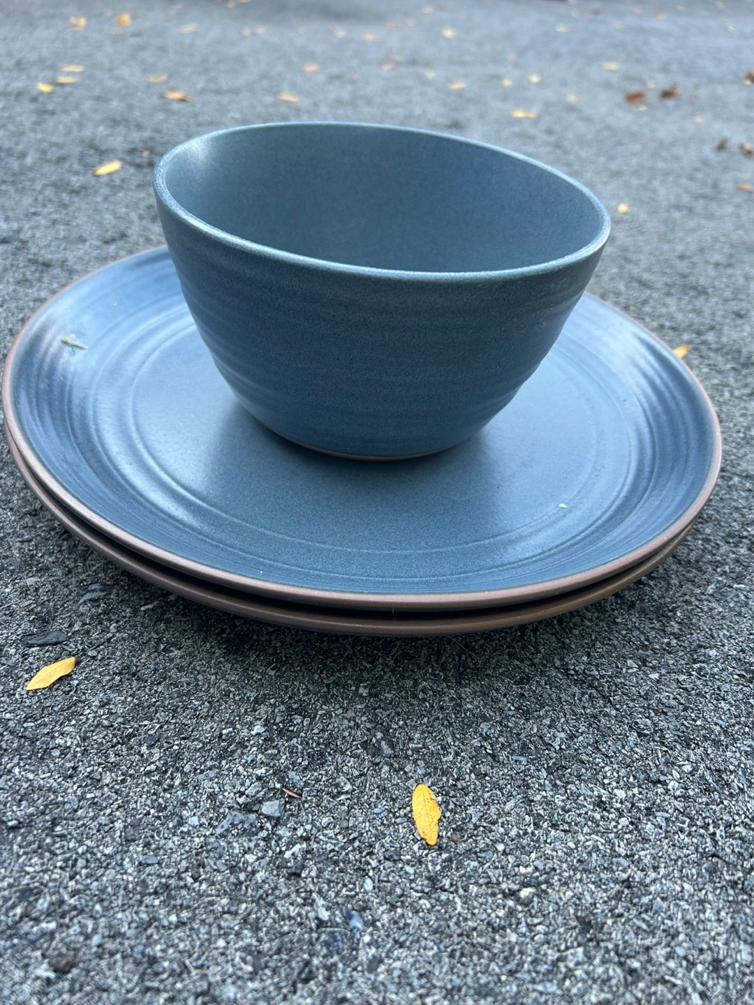 Selling a set of PC stoneware dishes! They're in great condition and have a lovely blue colour. These dishes are microwave and dishwasher safe, making them super convenient for everyday use. 2 plates and 1 bowl.