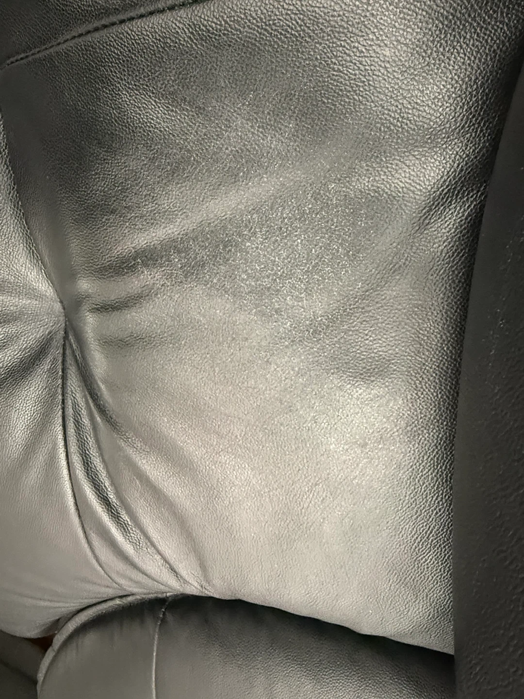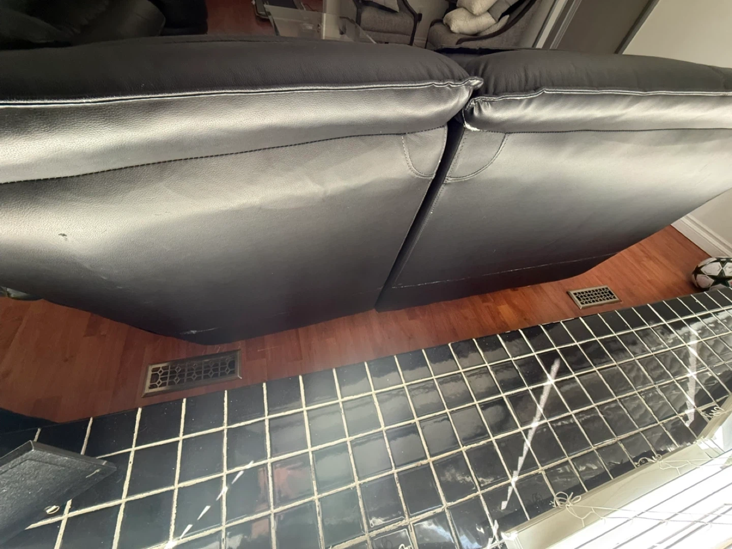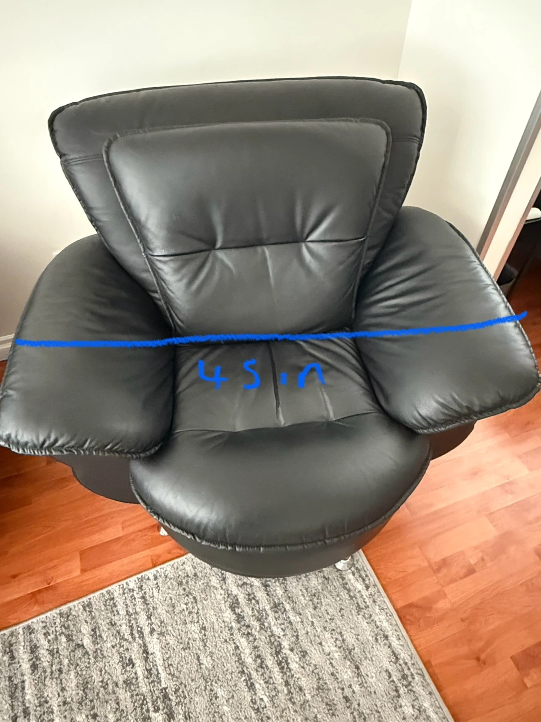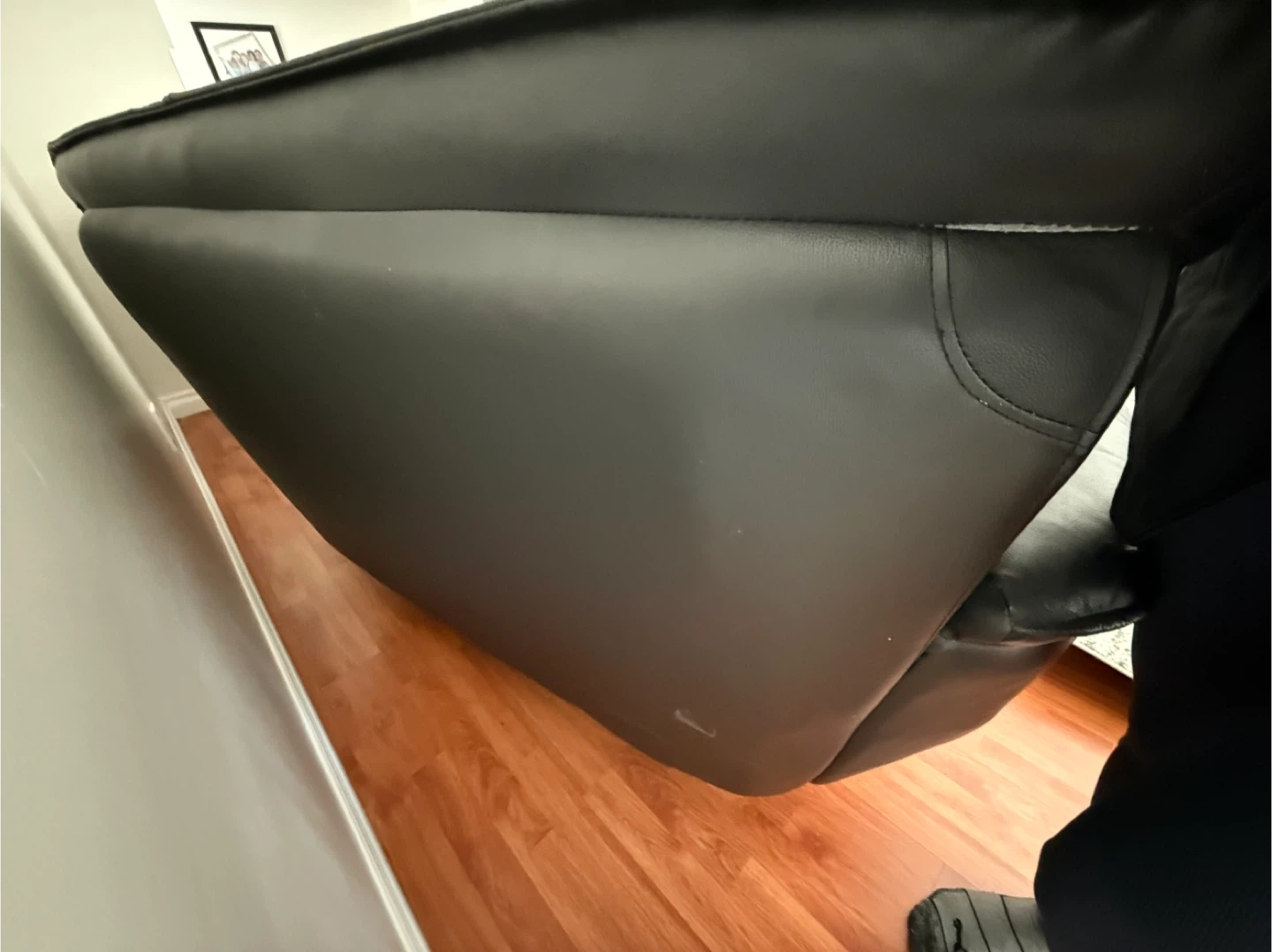 Three-piece black leather furniture set. Includes a loveseat, sofa, and armchair. Modern design. Good condition. Dimensions shown in images. Please look at the images. Some legs might need to be changed. The 2 seater has a rib as seen in pictures. Can send more pictures if needed. Overall it’s a good set. Not real leather.