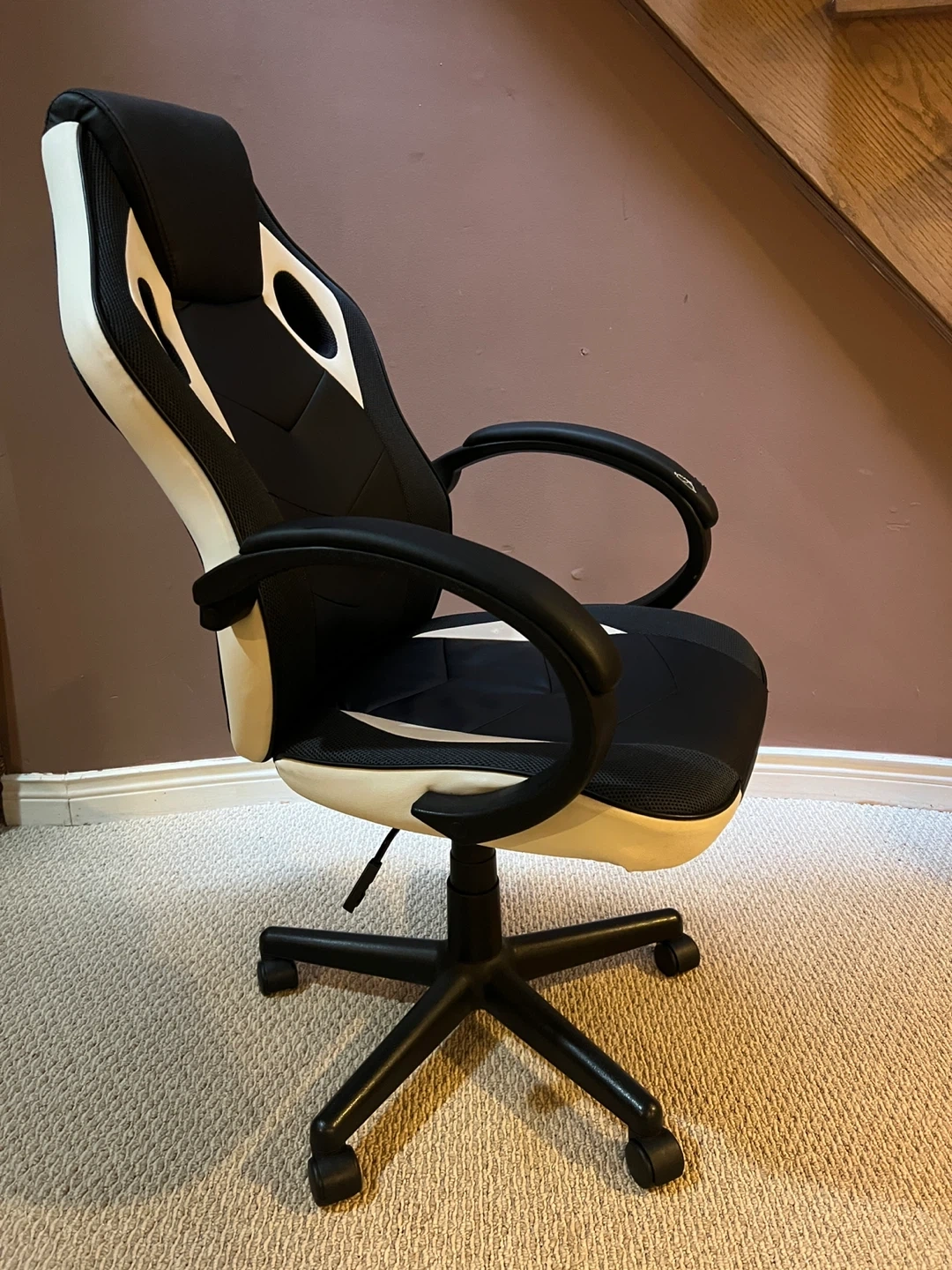 Comfortable black and white racing-style office chair in good working condition. Swivels, rolls smoothly, and has adjustable height. Great for home office, study, or gaming setup. ✔️ Comfortable padded seat and back ✔️ Adjustable height ✔️ Smooth-rolling wheels ✔️ Sleek racing-inspired design Note: Some wear on one armrest (see photos). Chair is otherwise solid and works great.