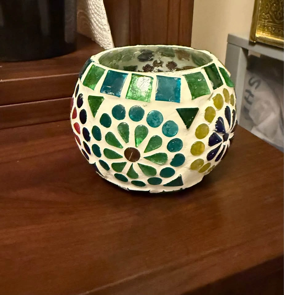 Mosaic Multicolored Tea light holder, comes with a wax tea light.