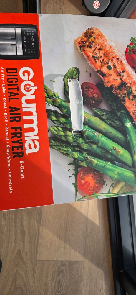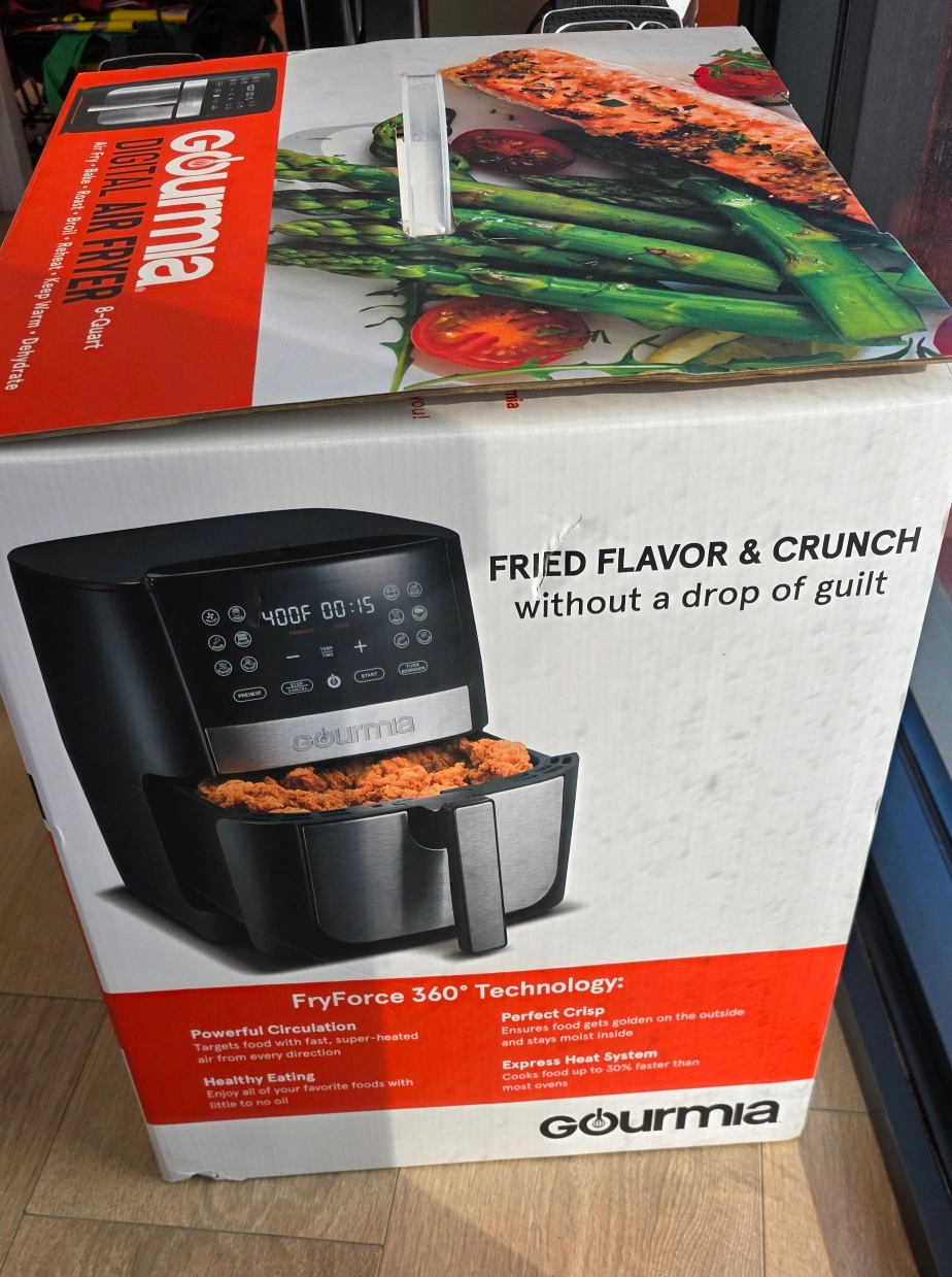 Step up your air frying game with this Gourmia digital air fryer! It features a digital display with preset options to make cooking easier. Air fry, bake, roast, broil, reheat, keep warm, and dehydrate with air up to less fat New, never used! with box and manual of instructions.