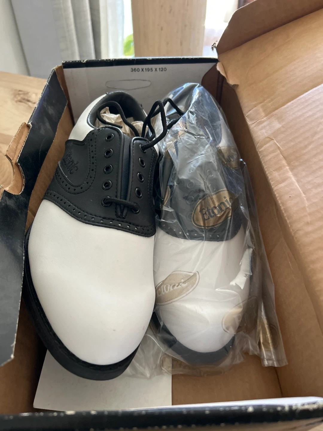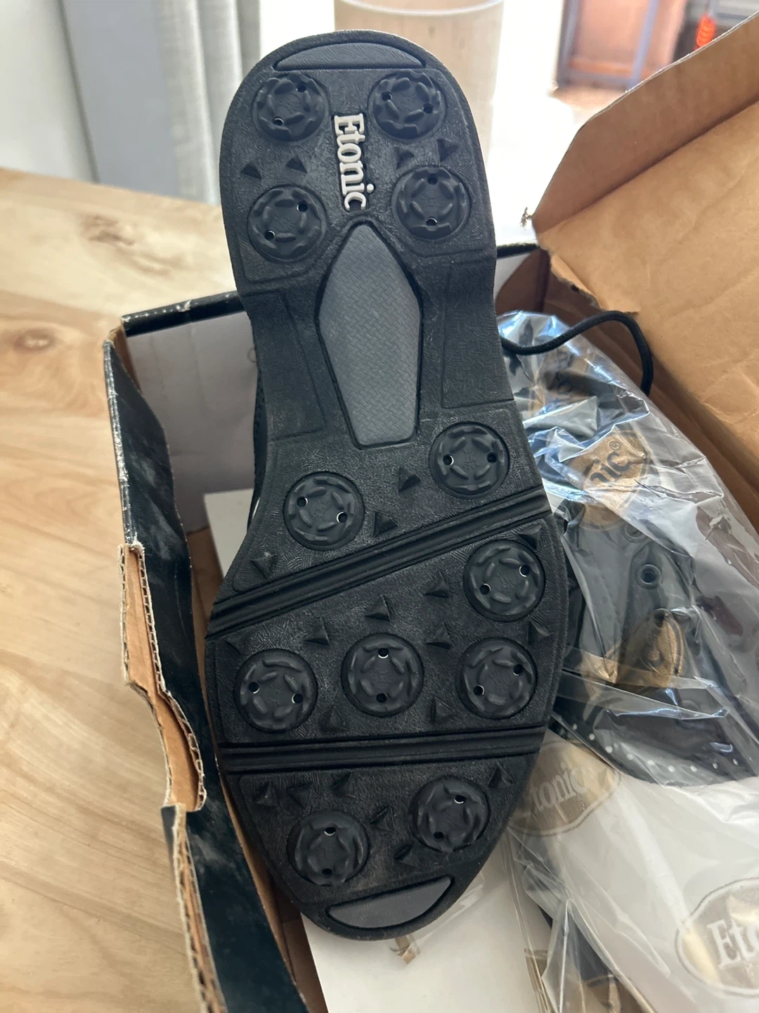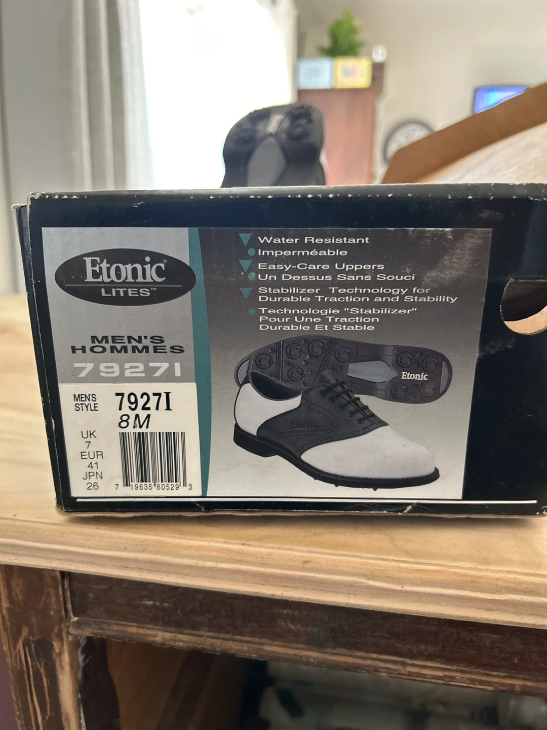 Selling a brand new pair of Etonic Lites men's golf shoes in size 8M. These shoes are water-resistant and have easy-care uppers. They also feature stabilizer technology for durable traction and stability. Comes with the original box!