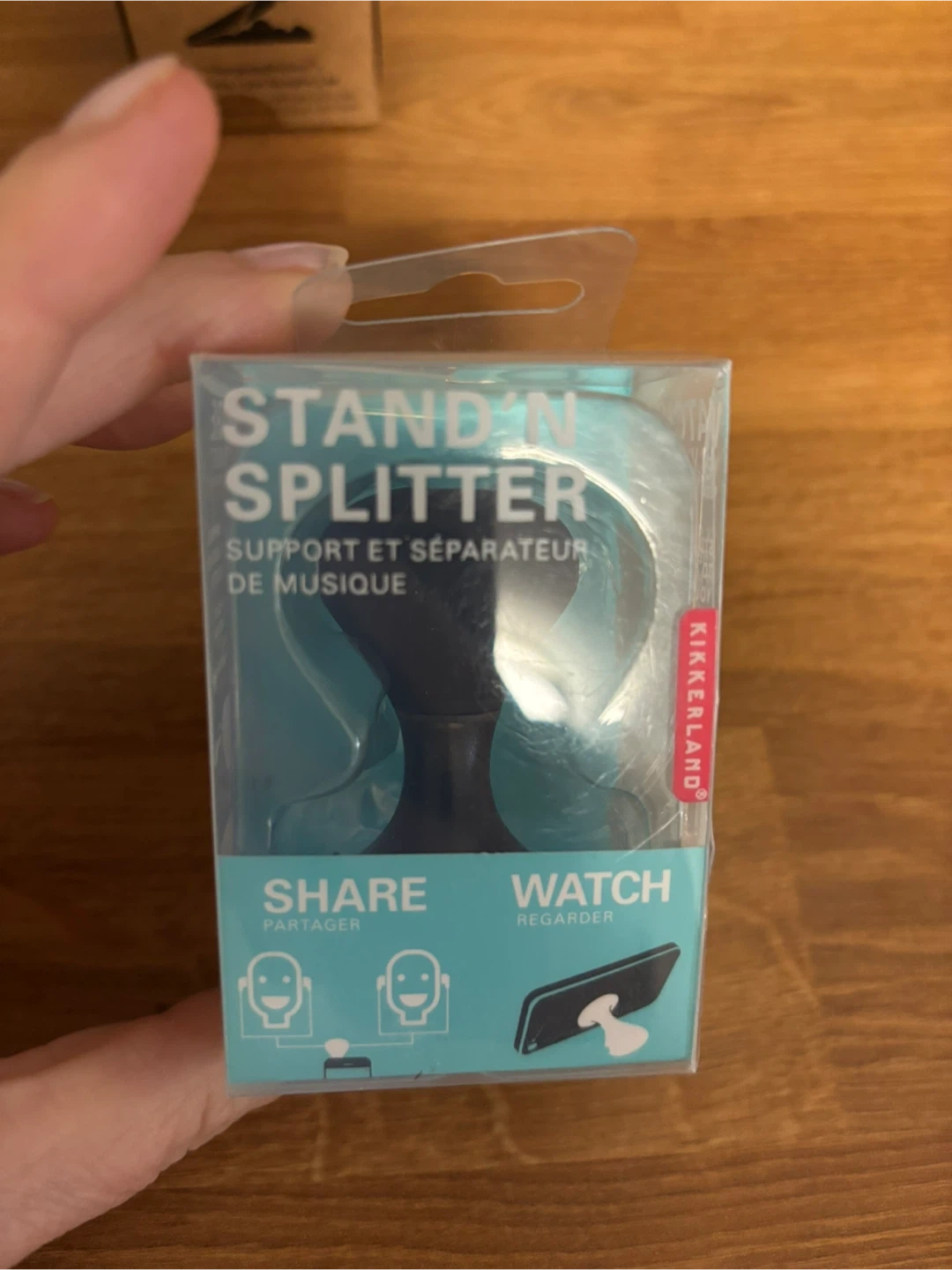 Selling a brand new Kikkerland Stand-In Splitter, still in its original packaging! This handy gadget supports and separates music, allowing you to share and watch content with ease. Perfect for listening with a friend or propping up your phone for a movie night!