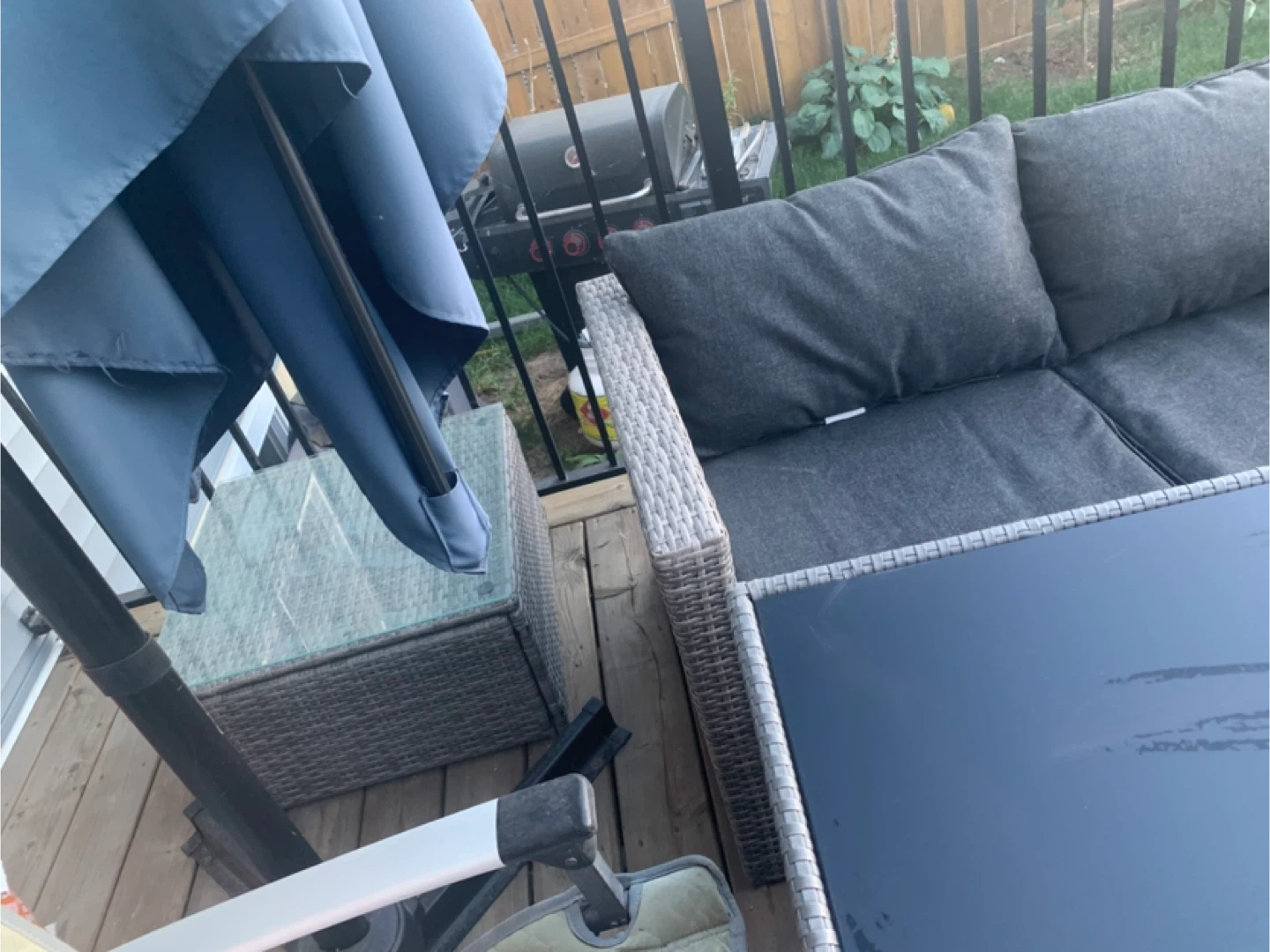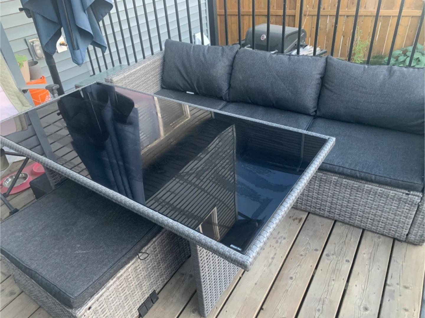 Selling a lovely outdoor wicker patio set.The set includes a sofa, a table with a glass top, and two ottoman. The cushions are a neutral grey colour, complementing the wicker. It's in great condition and ready to enhance your outdoor space