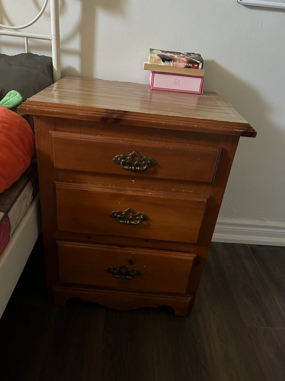 Selling a wooden nightstand with three drawers. It's perfect for adding some storage space next to your bed! It has a classic design with decorative drawer pulls. There are some signs of wear and tear, but it's still a functional and sturdy piece of furniture