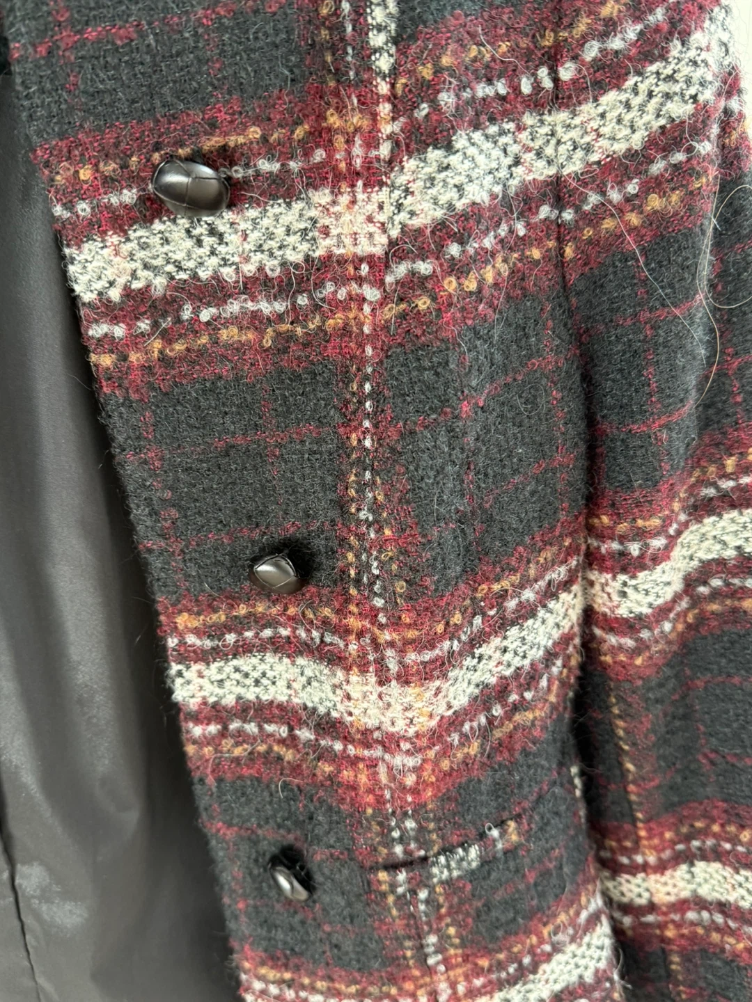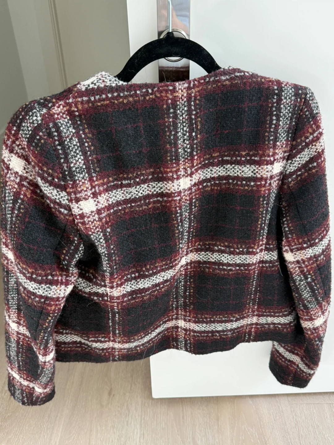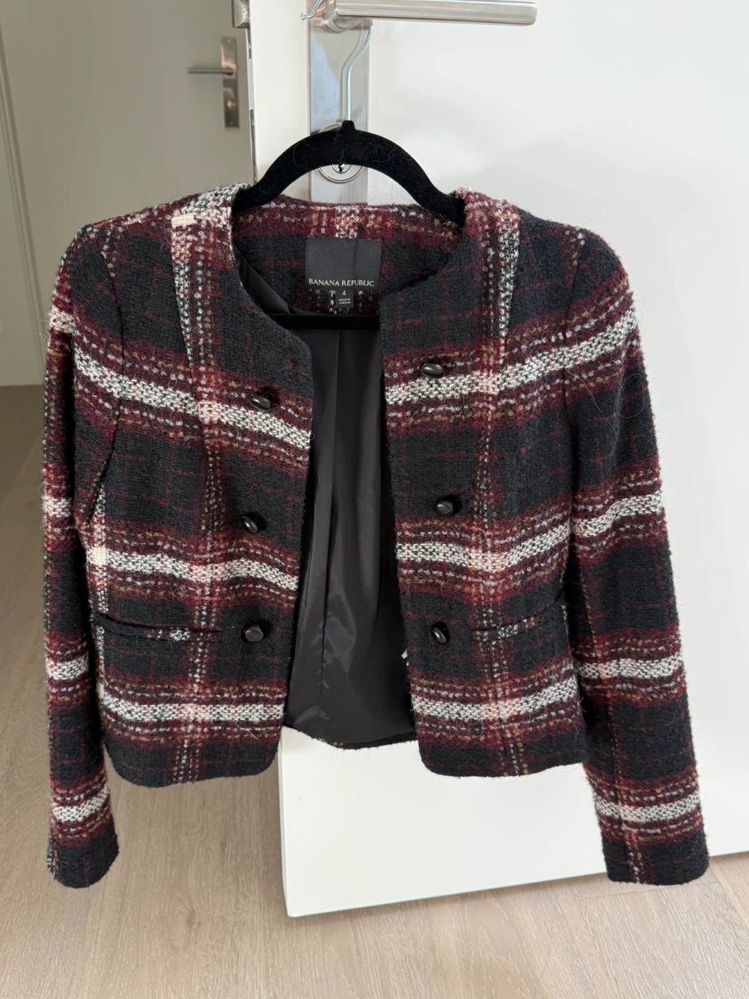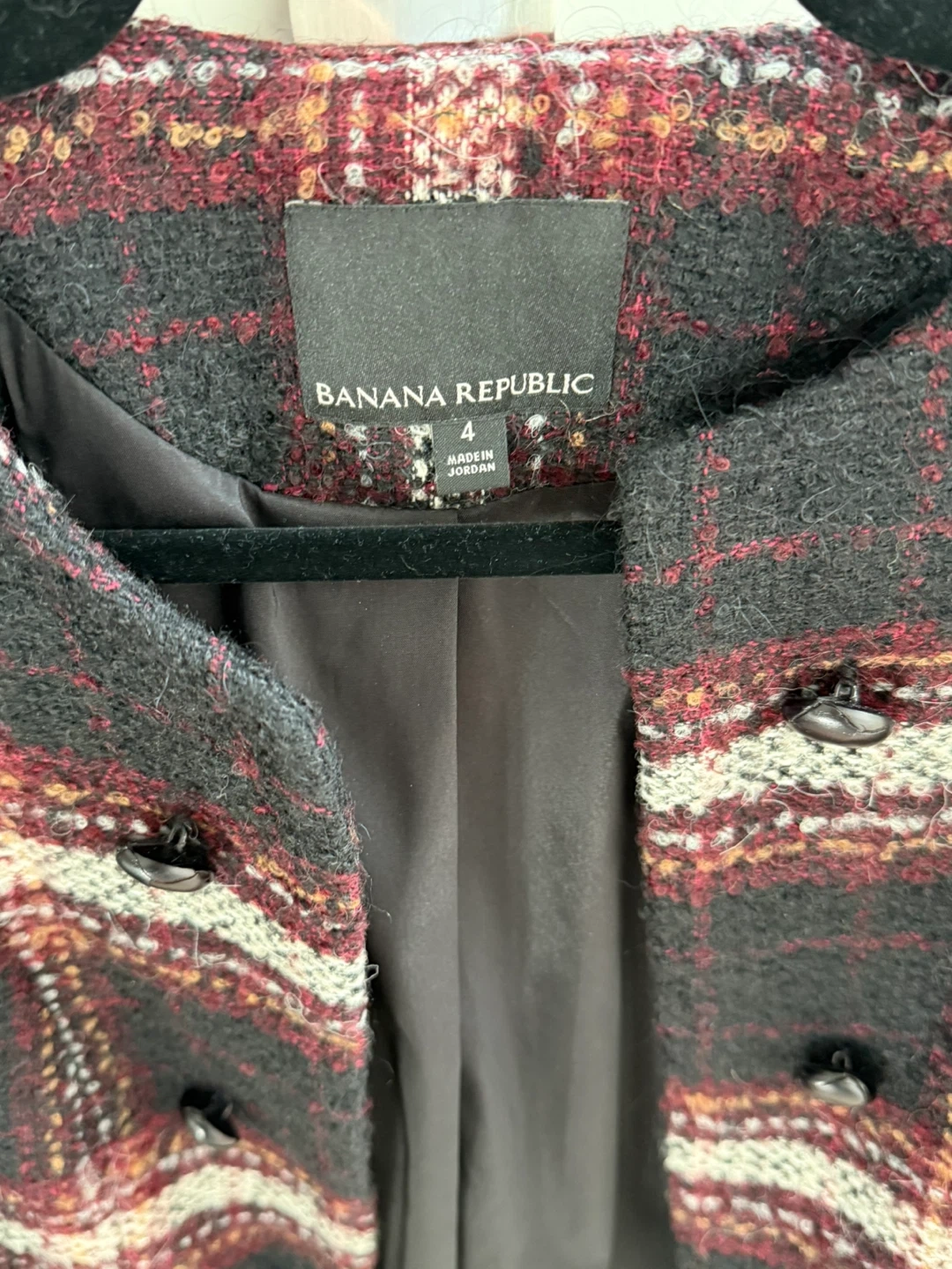 Selling a Banana Republic plaid jacket in size 4. It's in great condition and features a stylish plaid pattern with black buttons. Perfect for adding a touch of sophistication to any outfit!