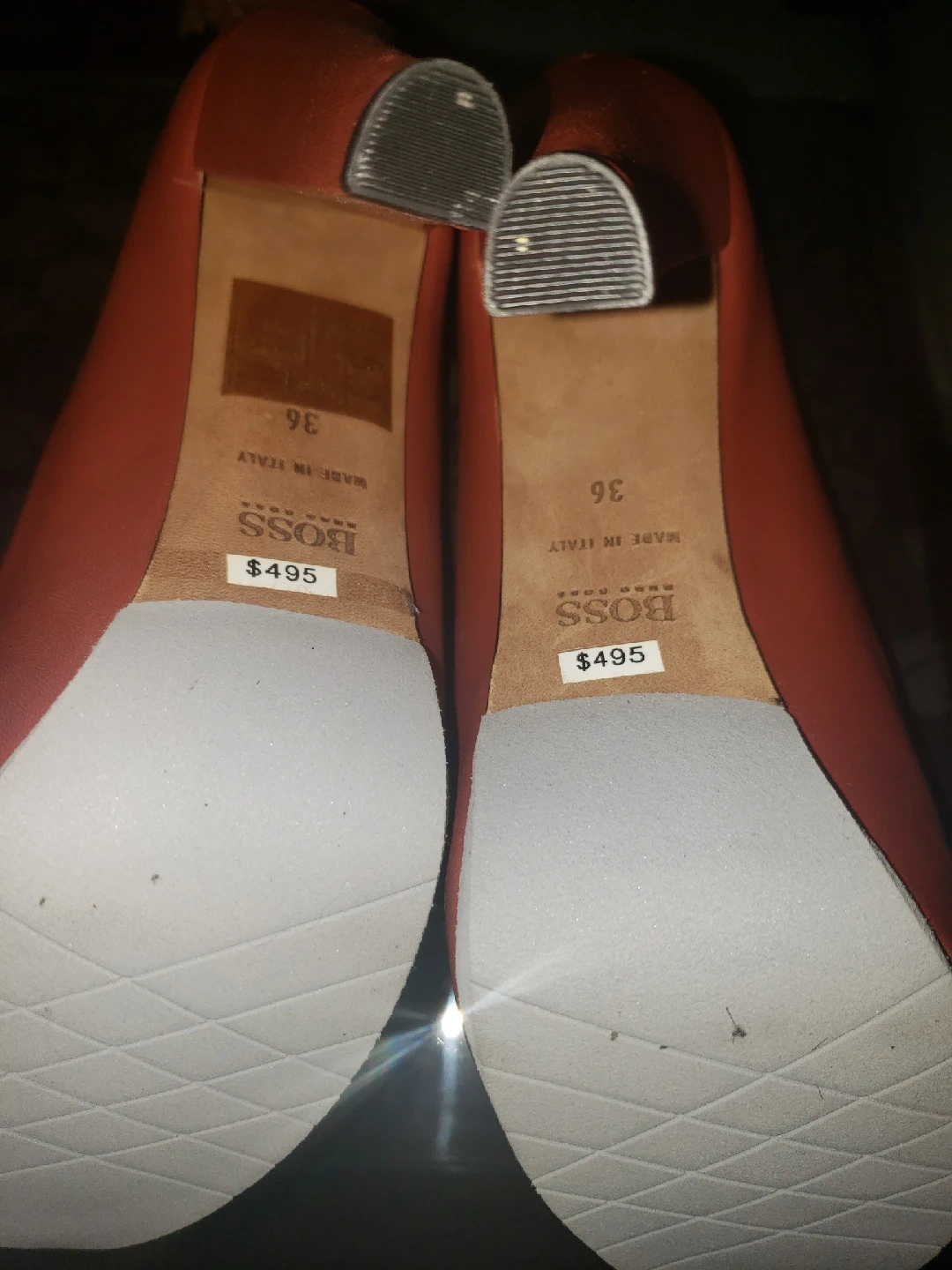 These Hugo Boss heels are a stylish addition to any wardrobe! They feature an open-toe design and a unique colour. The size is 6 (36 European). Originally bought for $495, they're in great condition and ready for a new home