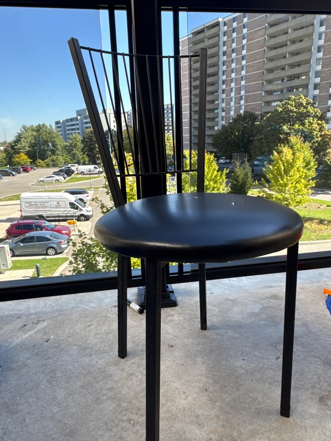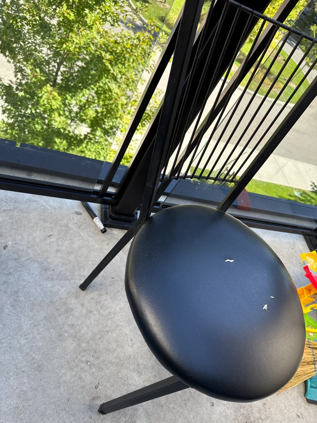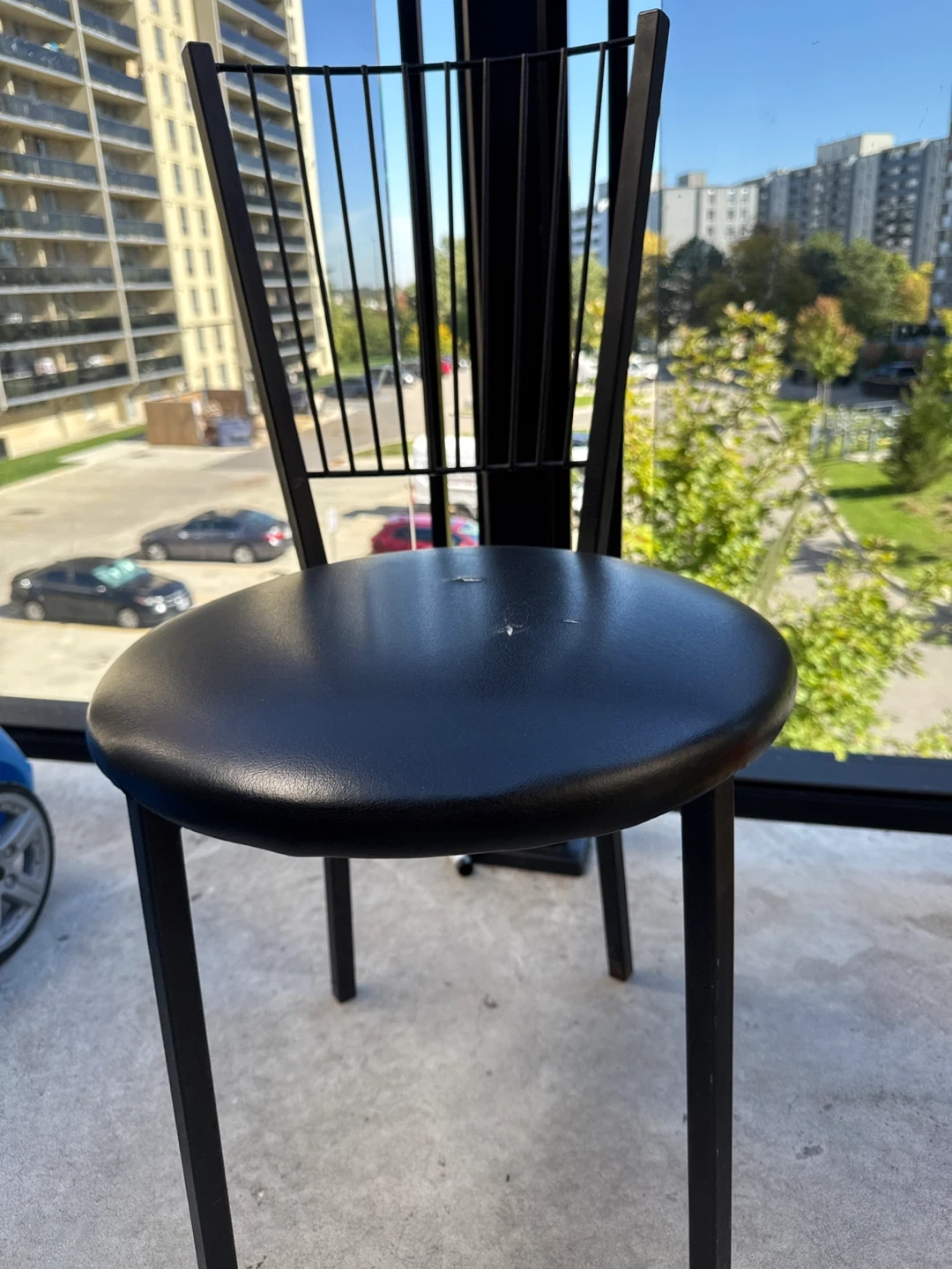 bar stool with a black metal frame and a faux leather seat. It has a modern, minimalist design that would look great in any kitchen or bar area. There are a few minor scuffs on the seat, but overall it's in good condition