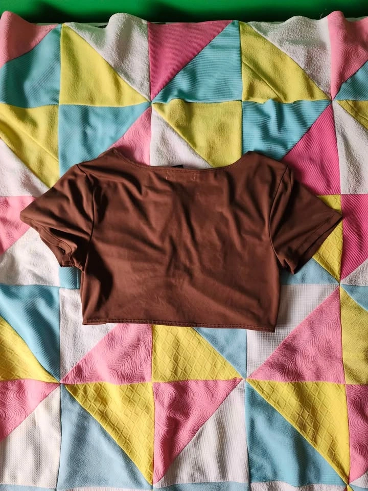 Super cute brown 00s crop top by Wet Seal!! summery and light weight. the ring detail in the middle gives this big 70s vibes too. Label size M, pit to pit laying flat is just under 16in, shoulder to bottom is just under 13in Item is in good used condition with no flaws or stains that I could notice