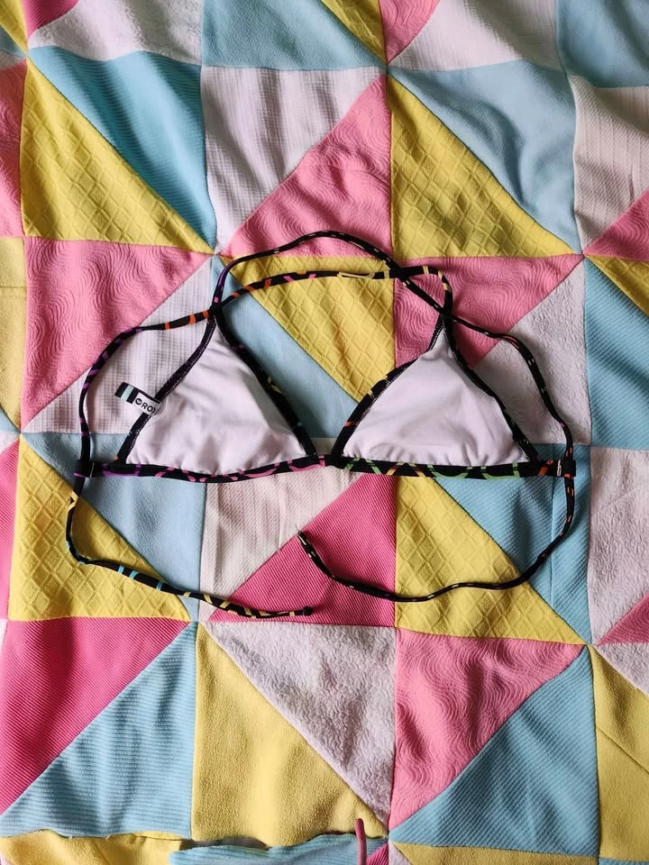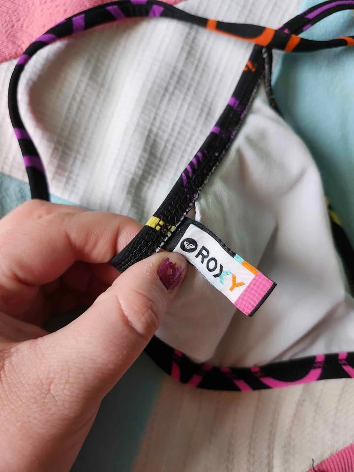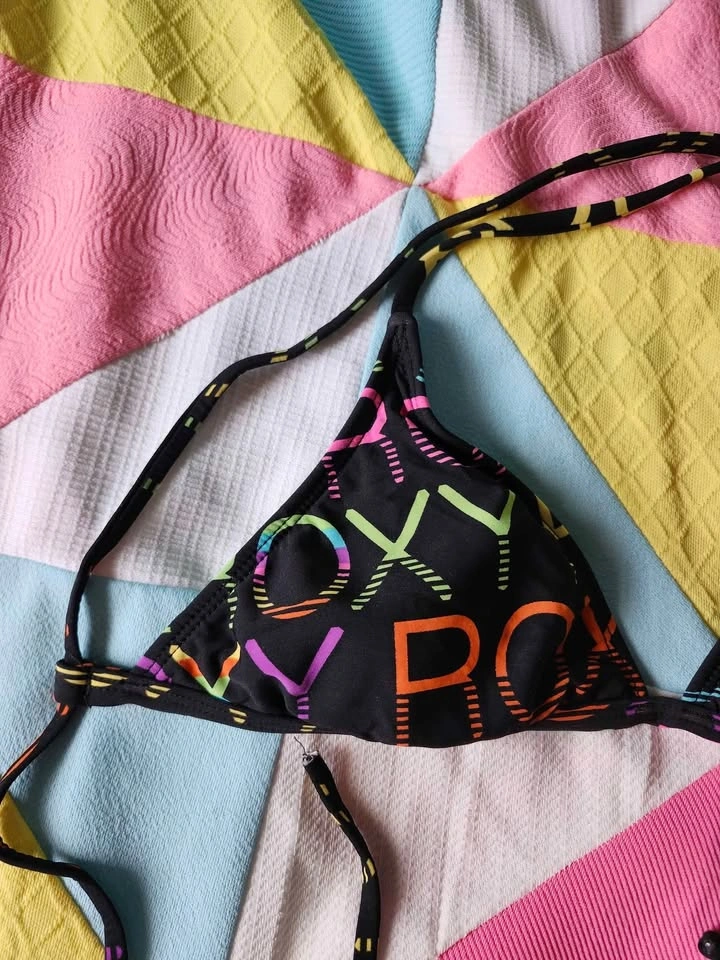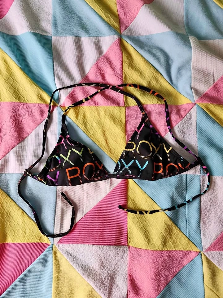 multi colour Roxy bikini top with adjustable straps super cute 00s bikini top by Roxy! has super adjustable straps, the back and shoulder straps are the same pieces no label size, top of bikini triangle to bottom is just about 7.5in, the length of item (ptp, not incl straps) is 18in item is in good used condition. looks like there used to be another strap on the back, as there is cuts on either side of the bikini, this does not effect wearability (see pic 5)(could also just have been Roxy leaving elastic exposed when it was made)