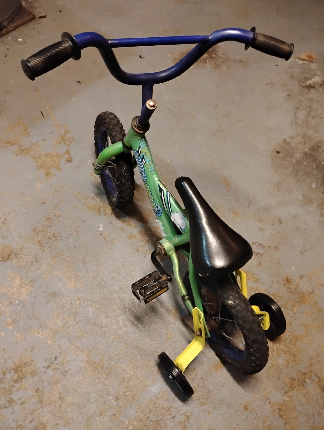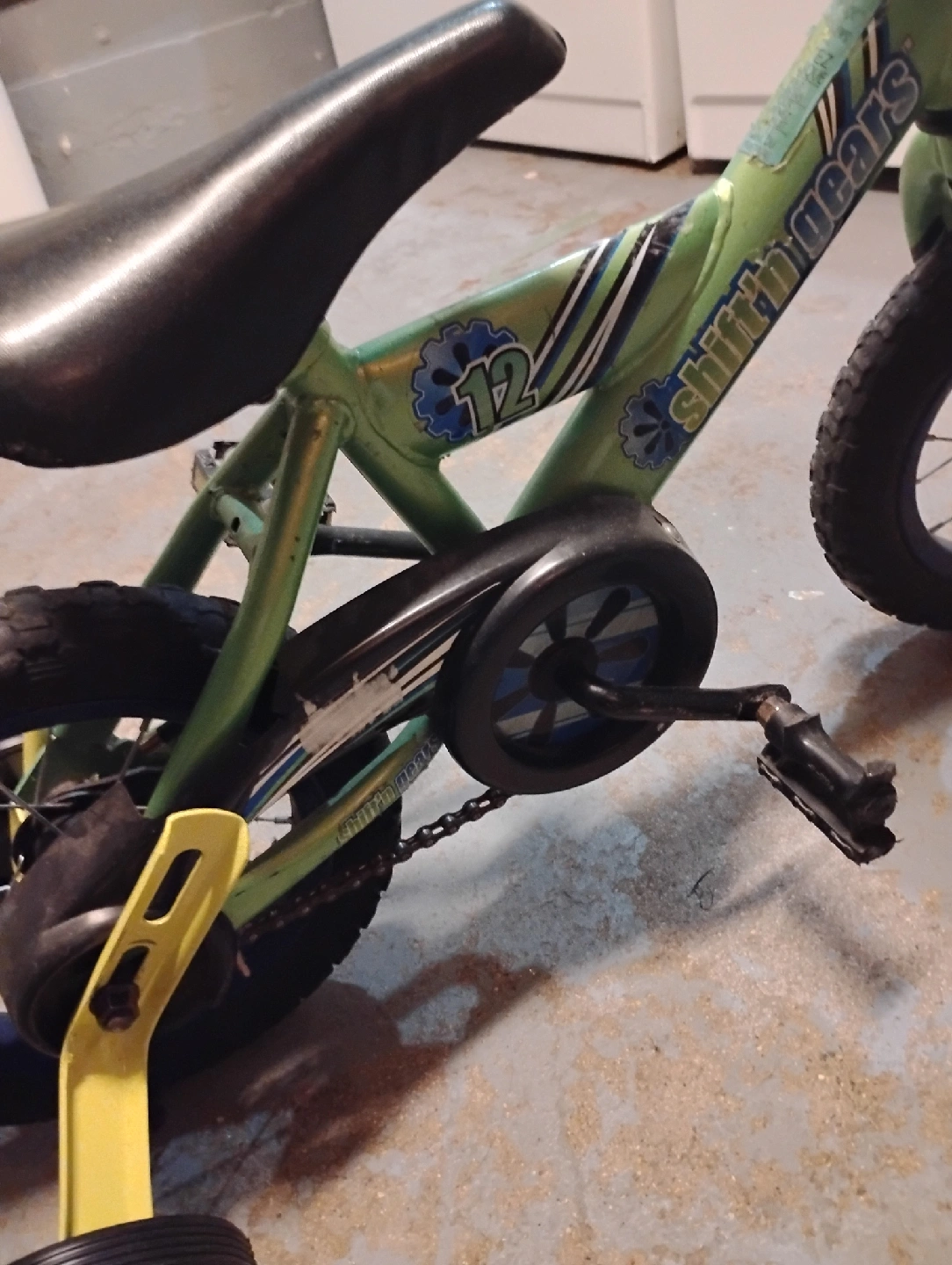 Selling a Shifting Gears kids bike! It's green and blue with a 12-inch frame. It has some wear and tear, but still lots of life left. Perfect for learning to ride!