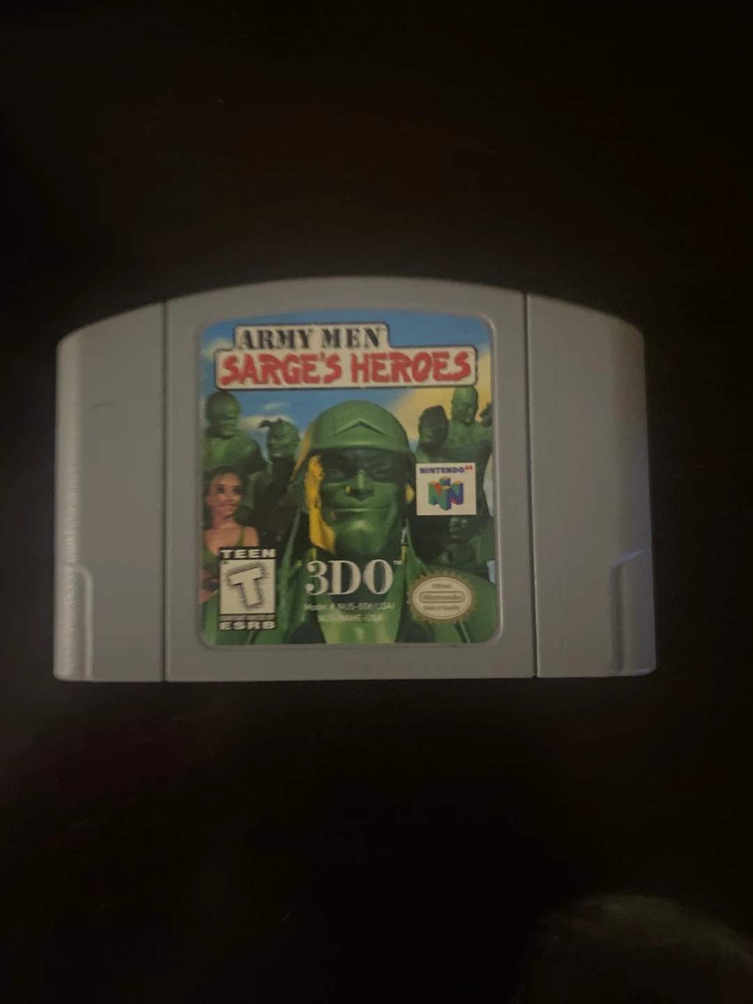 Selling a used copy of Army Men: Sarge's Heroes for the Nintendo 64. The game is rated T for Teen by the ESRB. Model number is NUS-006 (USA).