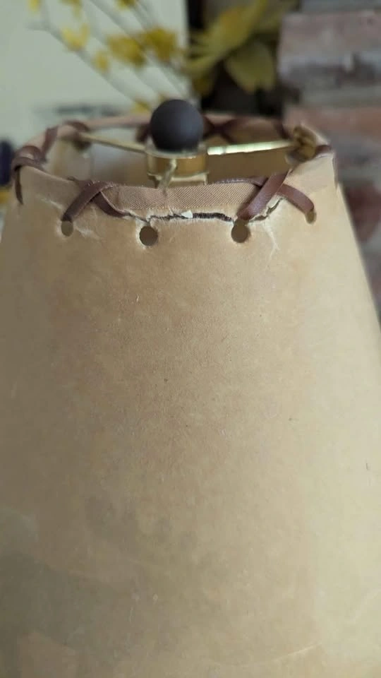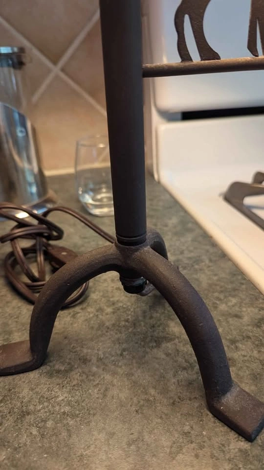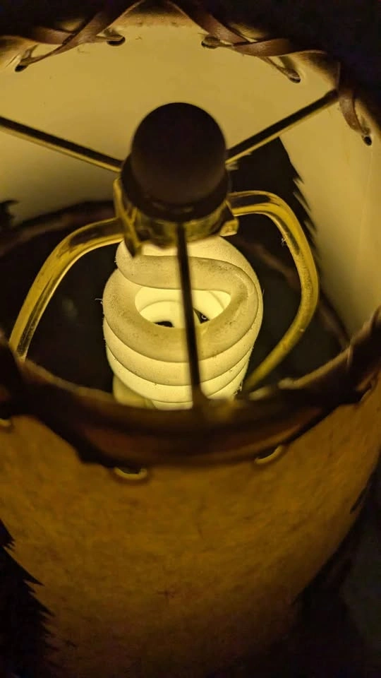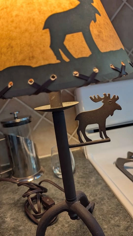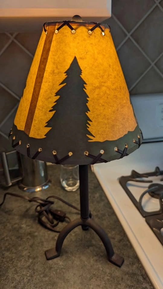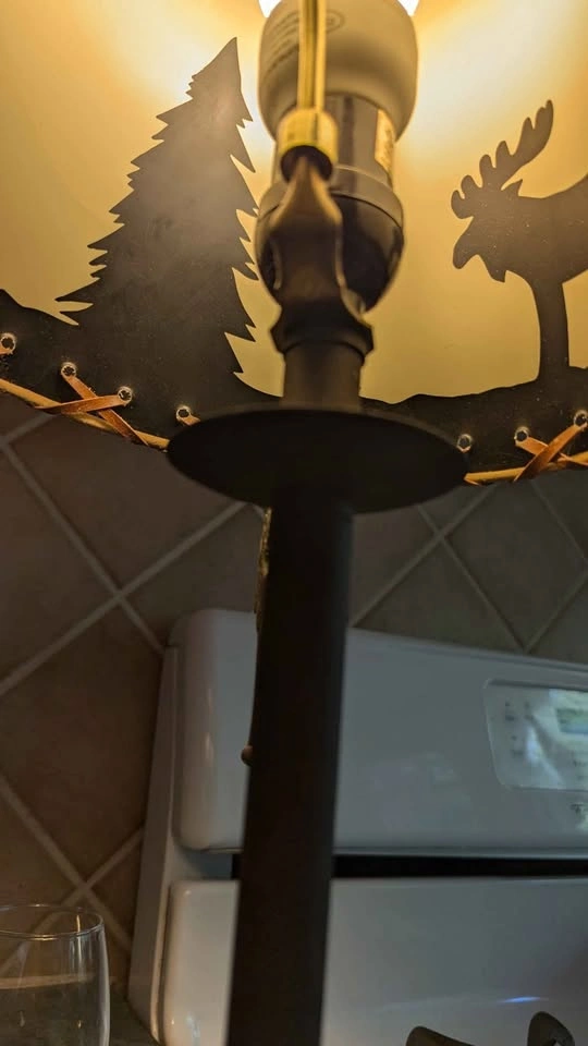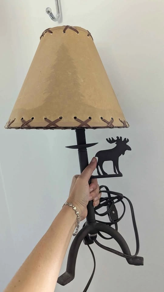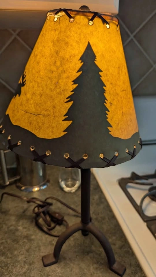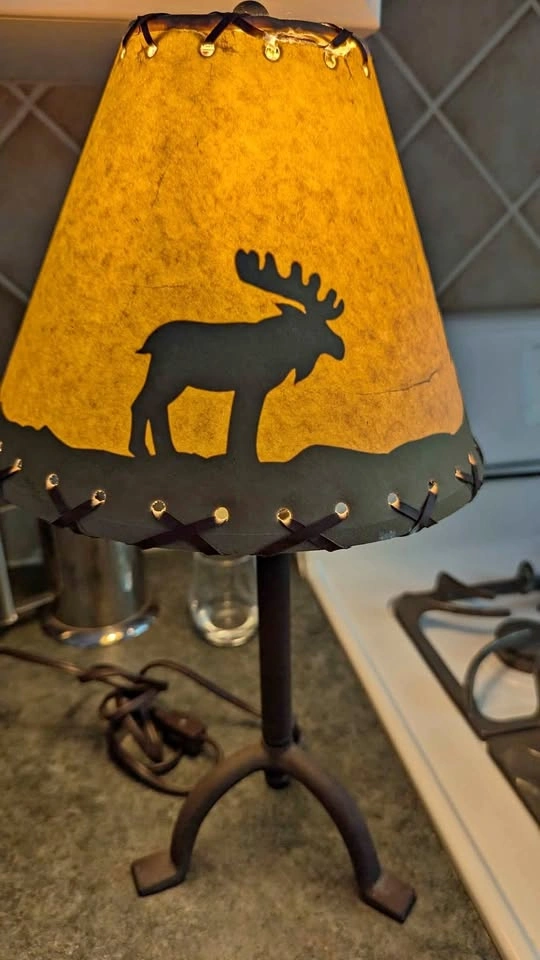 Works! Comes with bulb! Bit of a tear in the upper seam of the shade shown in photos (it's a paper material and could be repaired) But otherwise good condition, creates a silhouette of moose and trees when lit.