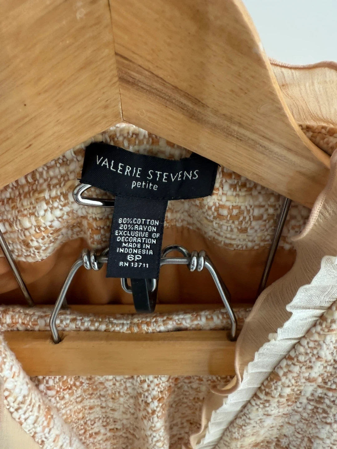 Selling a Valerie Stevens Petite skirt and jacket set. The set is a size 6P and made of 80% cotton and 20% rayon. It's a beautiful tweed-like material in a cream and orange colour. Perfect for a professional or dressy occasion!