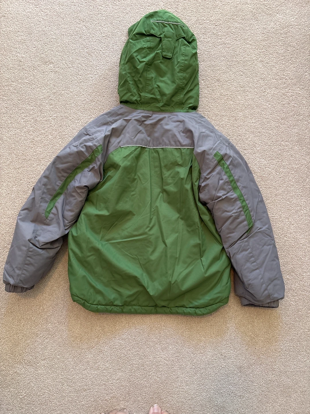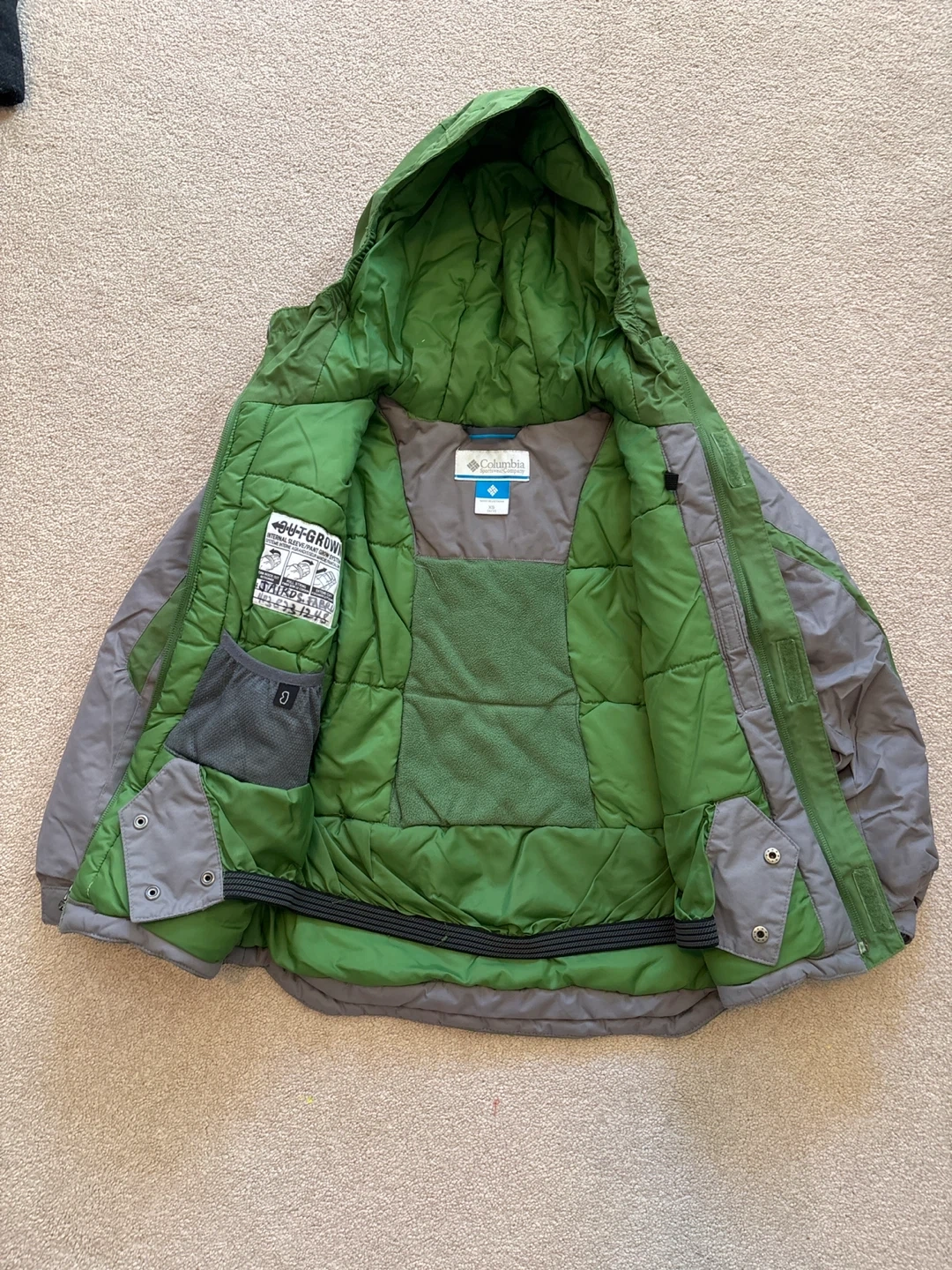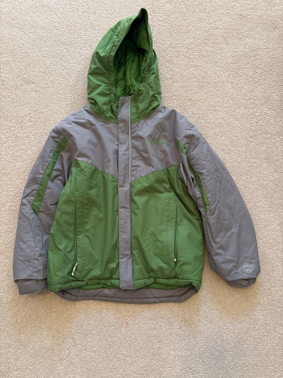 Cozy Columbia winter jacket for boys, size 6-7 It's in great shape and ready to keep someone warm this winter. The colours are a nice mix of green and grey. Perfect for hitting the slopes or just playing in the snow