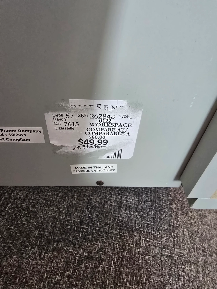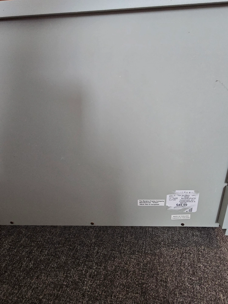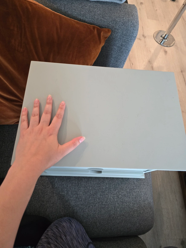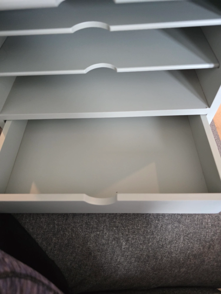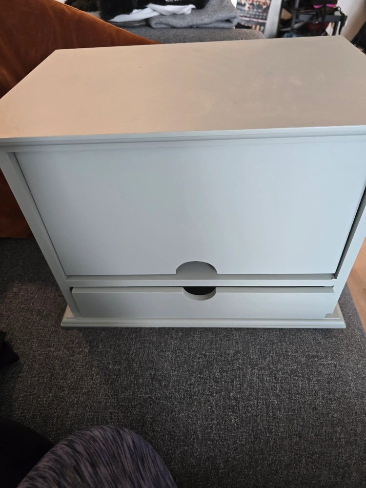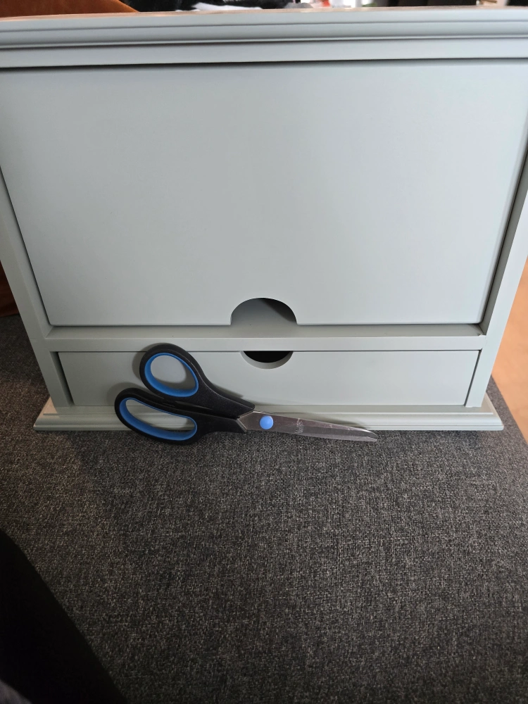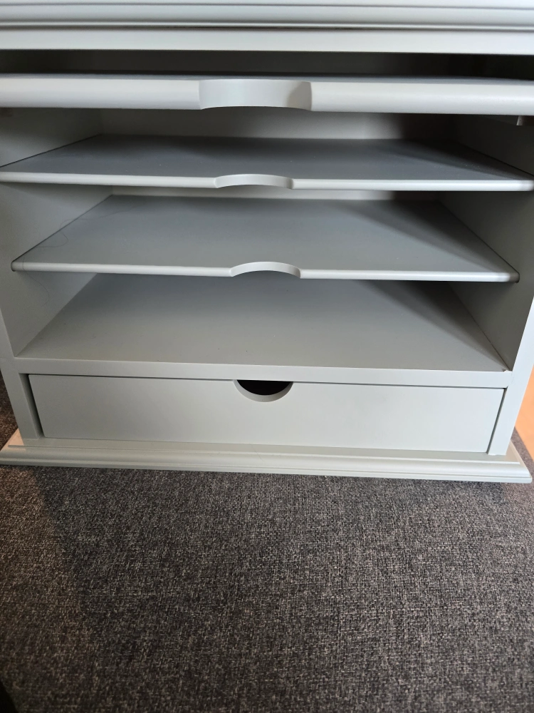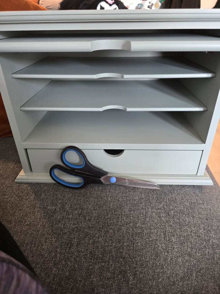 Selling a grey wooden storage cabinet. It features a drawer and several shelves, perfect for organizing your space. It's in as new condition. scissors and hand for size reference.