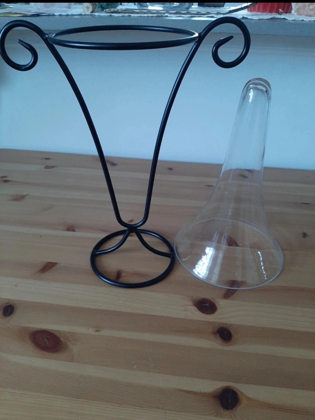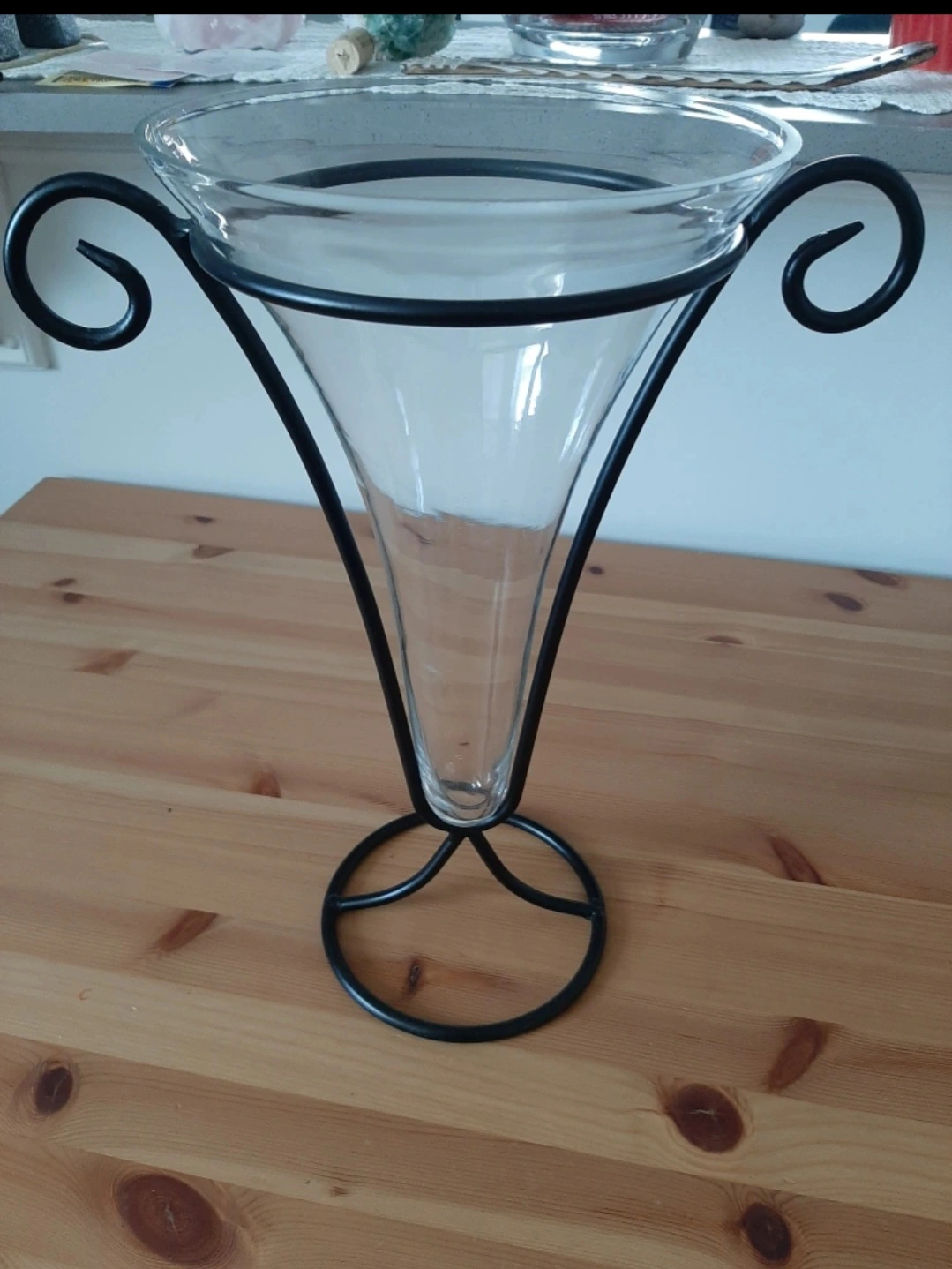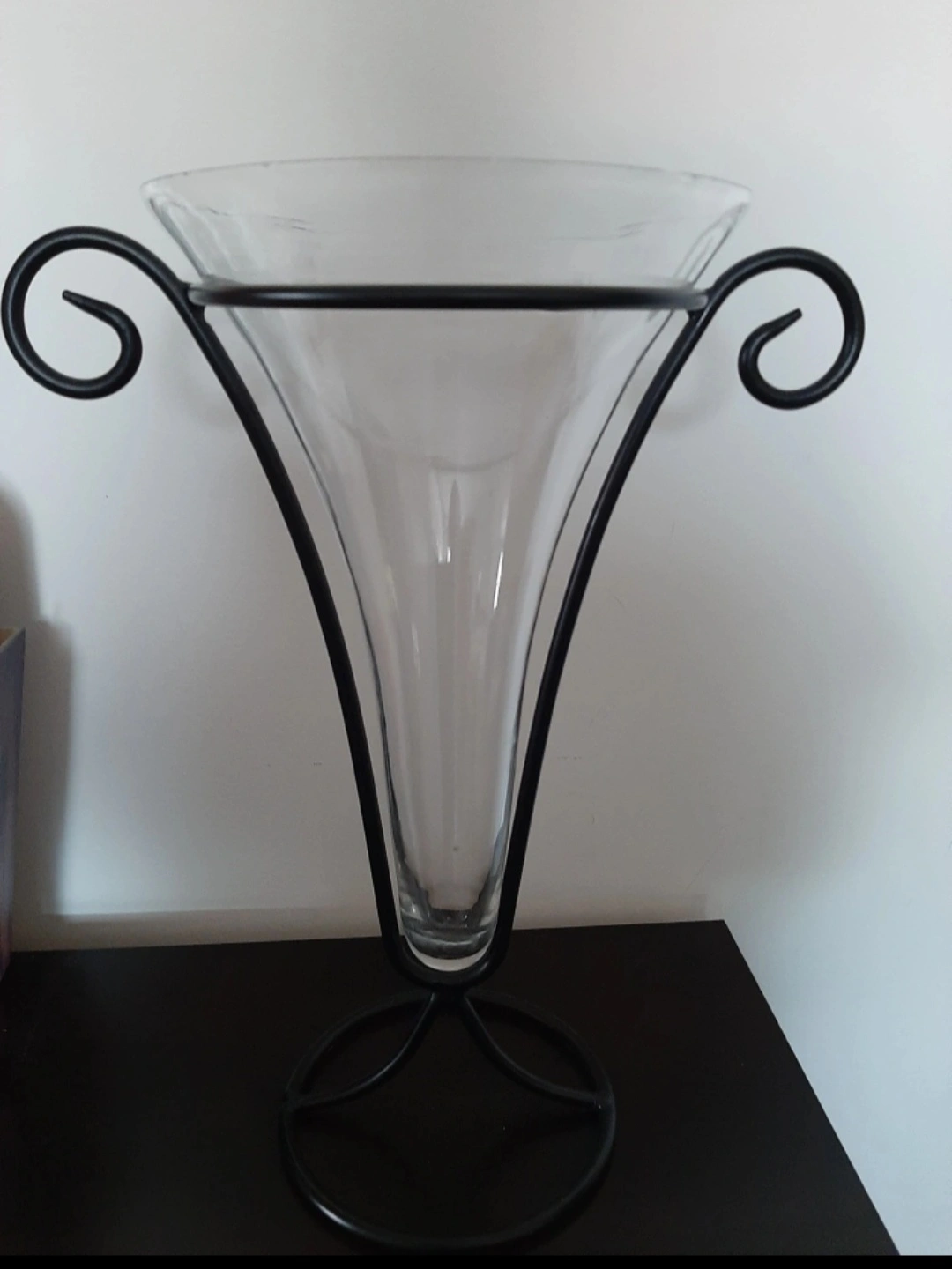 Selling a lovely glass vase with a black metal stand. It's in great condition and would look beautiful with flowers or as a decorative piece in your home. The glass is clear and the stand has a nice, sturdy design. Perfect for adding a touch of elegance to any room!