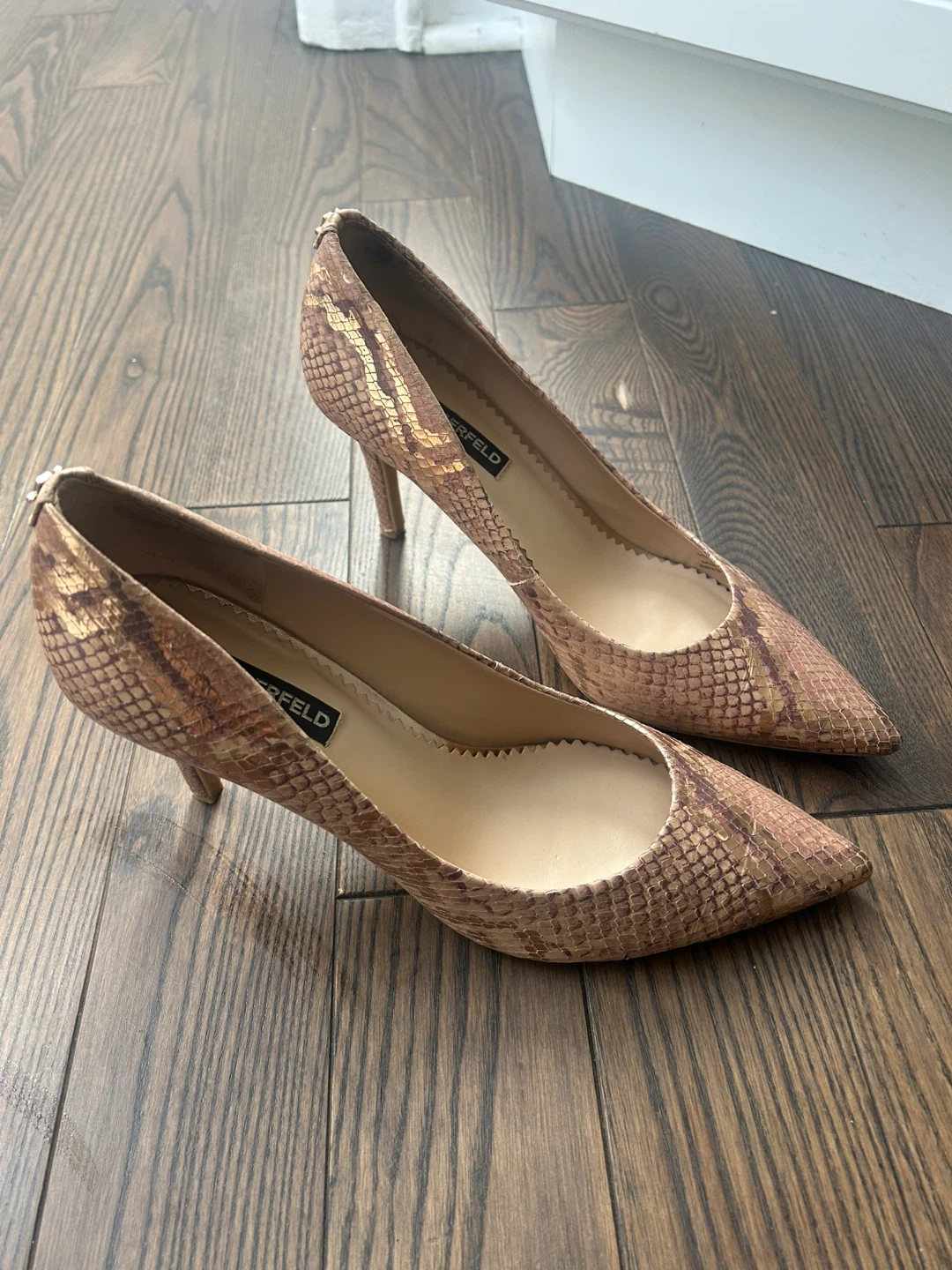 Karl Lagerfeld Paris heels in a snakeskin rose print. They have a stylish pointed toe and a slim heel. Great condition. Size 10 but easily could fit size 9. Pick up downtown or High Park area