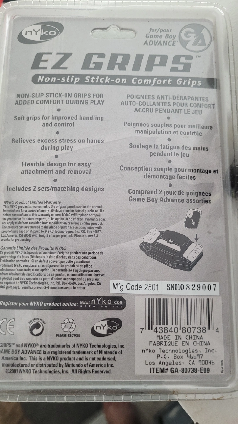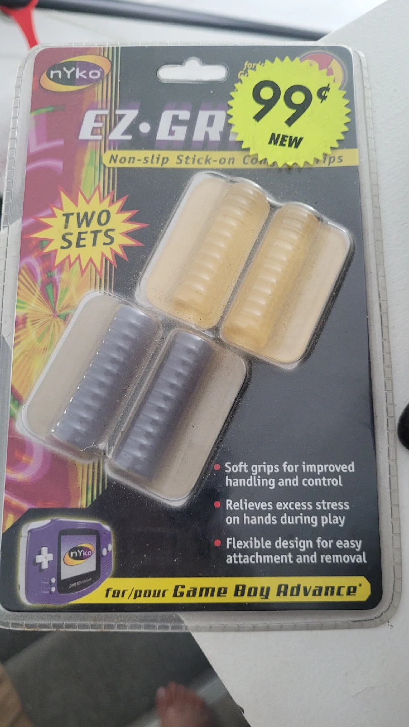 Brand new Nyko EZ-Grips for your Game Boy Advance! These non-slip stick-on comfort grips are designed for added comfort during play. They help relieve excess stress on hands and are easy to attach and remove. Includes 2 matching sets. Originally priced at $0.99