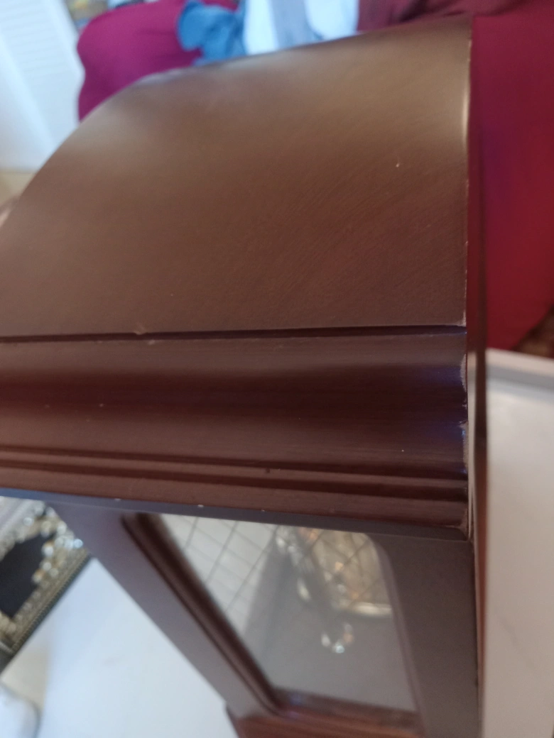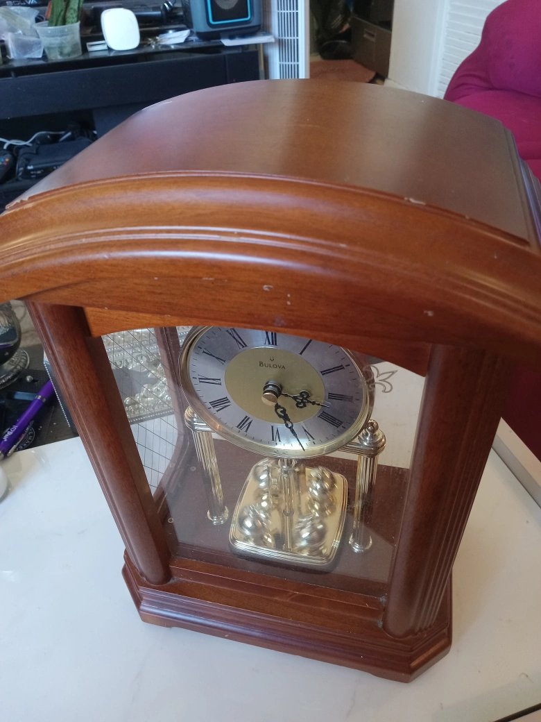 A beautiful Bulova mantel clock featuring Westminster chimes. It has a classic design with Roman numerals and a pendulum. Perfect for adding a touch of elegance to any room!