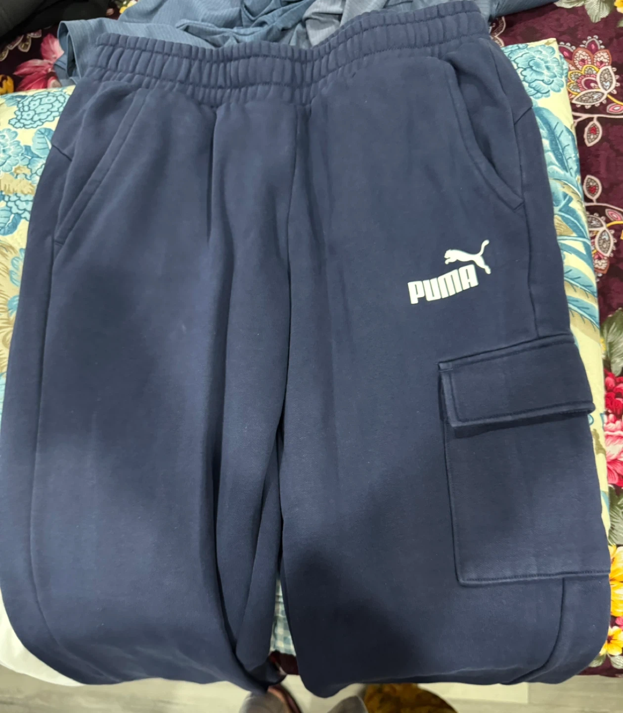 Selling a pair of Puma cargo sweatpants in blue! They're a size medium and have a handy cargo pocket on the side. Great for casual wear or lounging around at home. The material is soft and comfy, perfect for everyday use