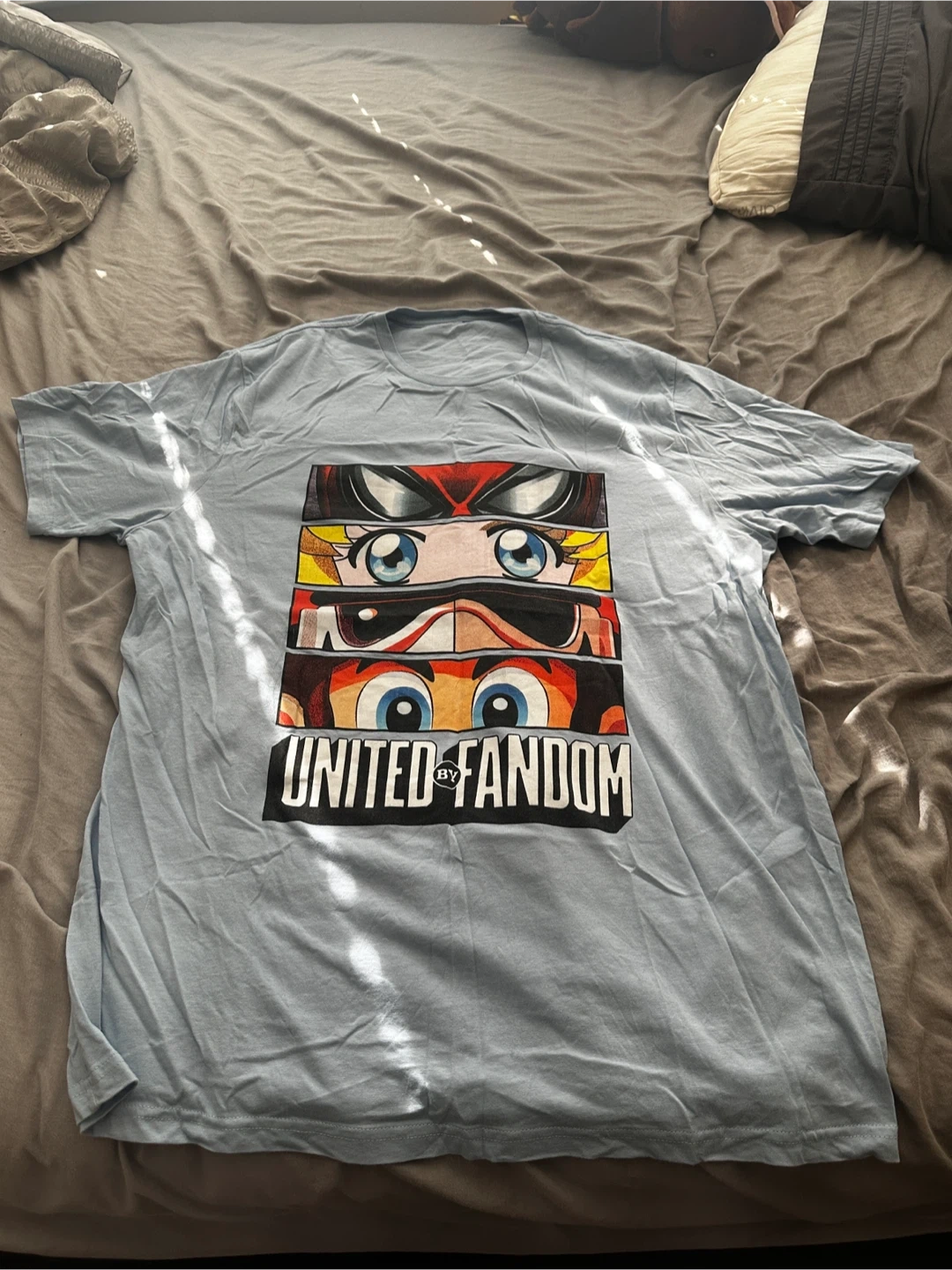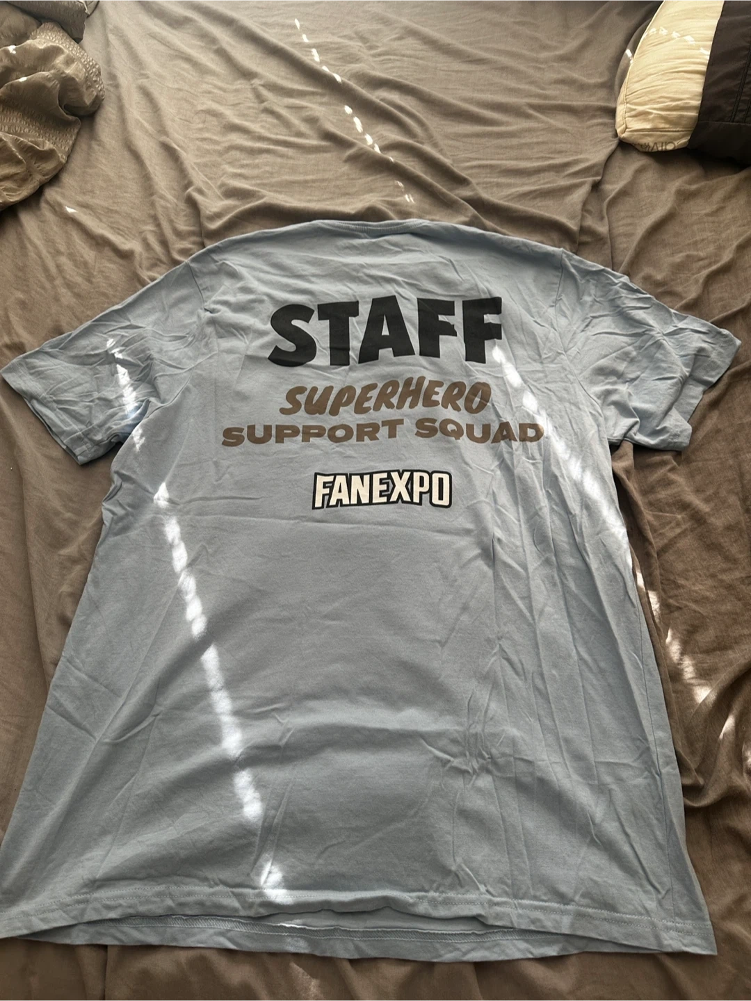 I know these are popular at the show every year. I washed it and wore it only while working at FanExpo. Take it home! And wear it next year. Here's a light blue T-shirt with a cool design. It says 'United By Fandom' on the front with some cool anime-style eyes. The back says 'Staff, Superhero Support Squad' and 'Fan Expo'. It's in great condition!