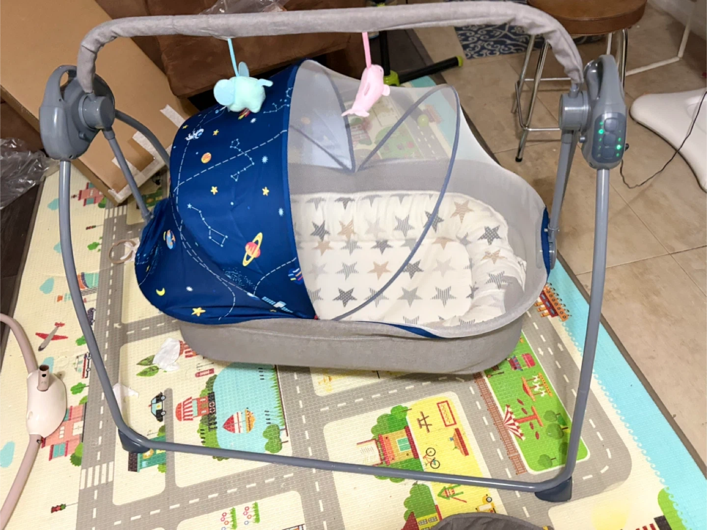 Brand new baby swing in great condition! It features a cute canopy with a star and space themed design, perfect for keeping your little one shaded and entertained. The mobile includes plush toys to engage your baby's attention. Comes with the original box