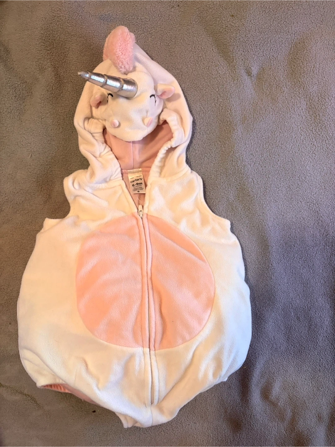 A super cute Carter's unicorn costume for your little one! It's sized 6-9 months and features a soft, plush material. Perfect for dress-up or Halloween!
