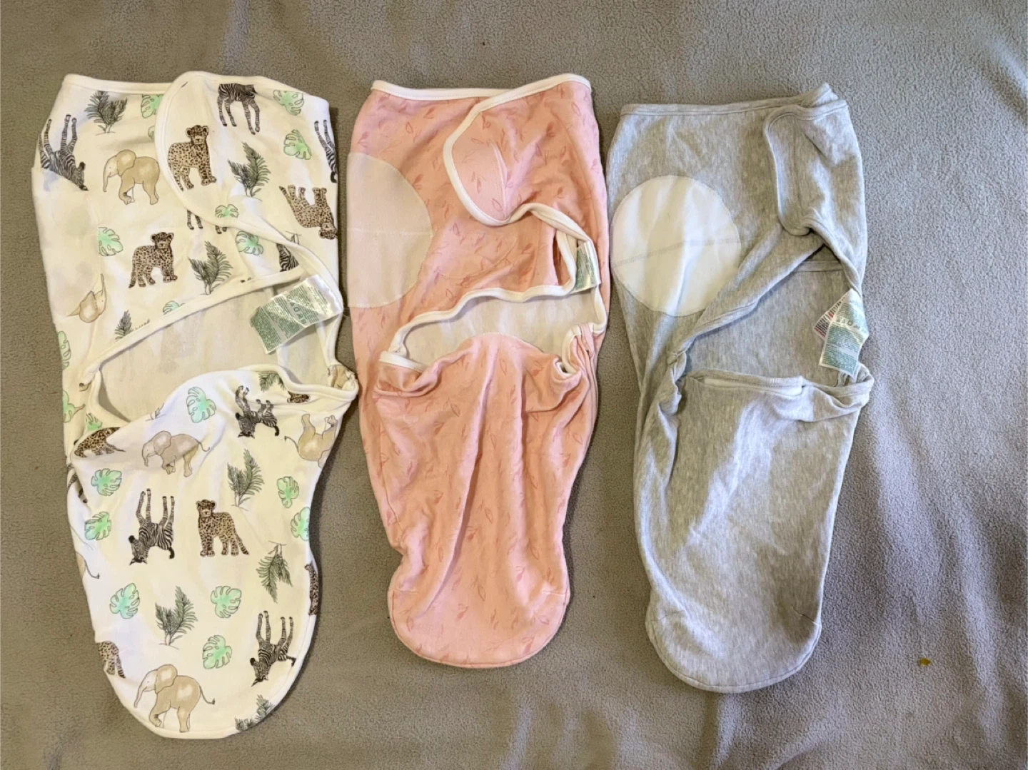 Selling a set of three baby swaddles in gently used condition! Includes one white swaddle with an animal print, one pink swaddle, and one grey swaddle. Great for keeping your little one snug and secure.