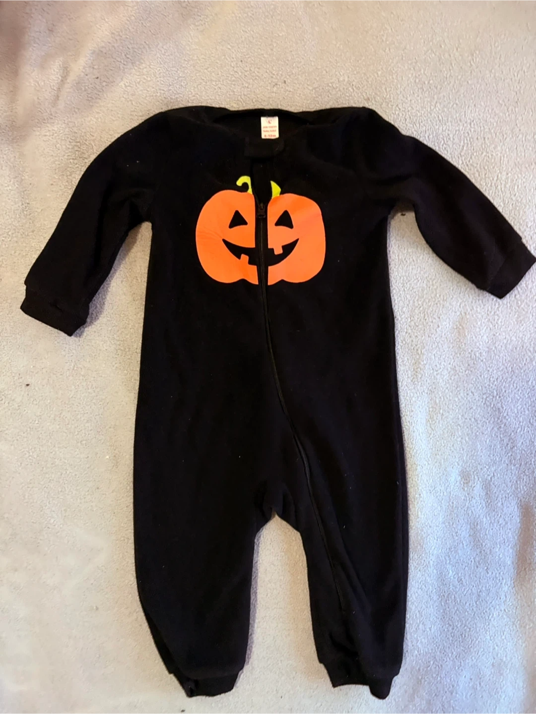 Here's a cute Carter's onesie, perfect for Halloween! It's black with an adorable orange pumpkin design on the front. The size is 6-12 months. Great for your little one!