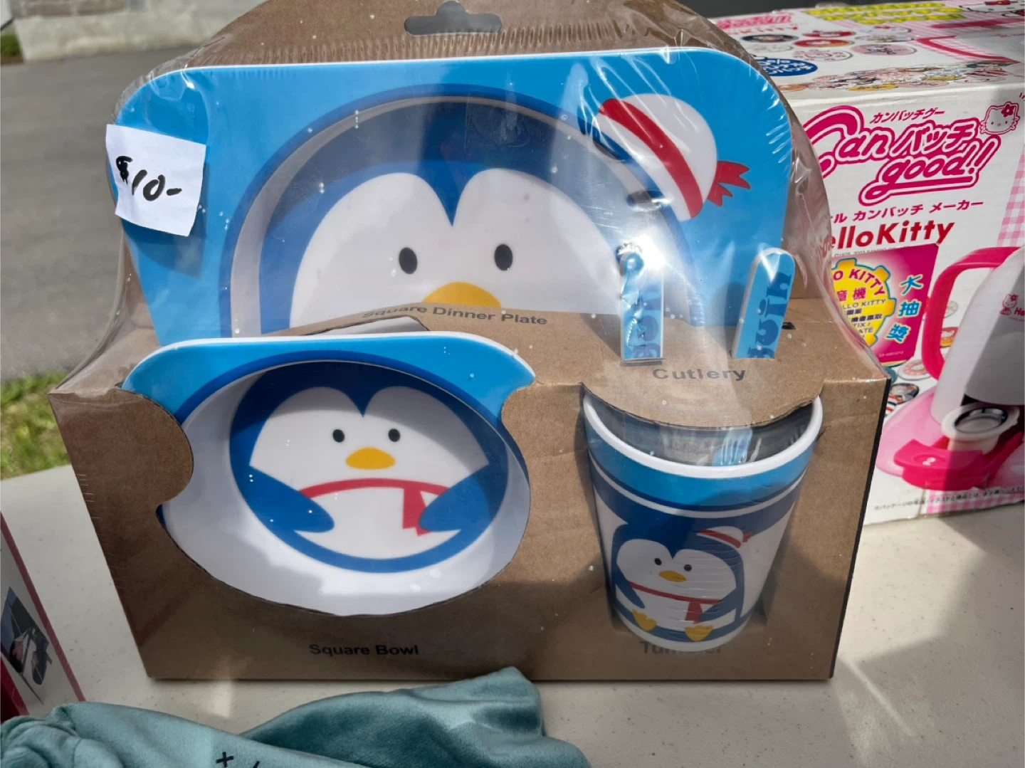 Brand new penguin-themed kids dinner set! Includes a square dinner plate, square bowl, tumbler, and cutlery. Super cute design for your little one