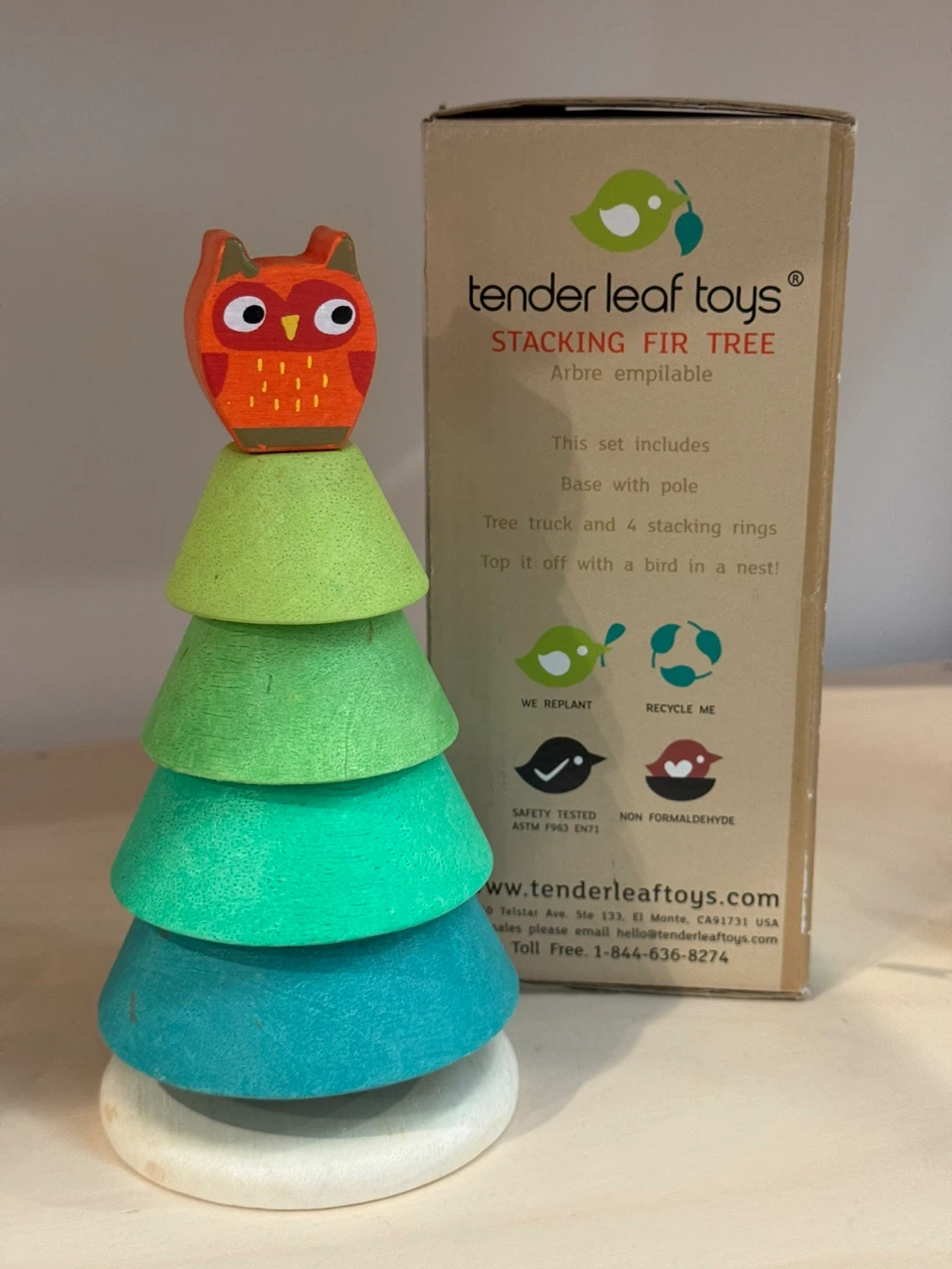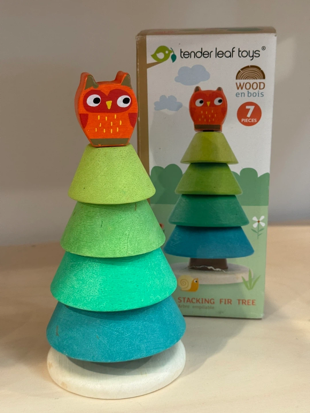 This Tender Leaf Toys Stacking Fir Tree is a delightful wooden toy for kids! It includes a base with a pole, a tree trunk, four stacking rings, and a bird to top it off. The set has 7 pieces in total and comes in its original box. It's a great way to encourage stacking skills and imaginative play!