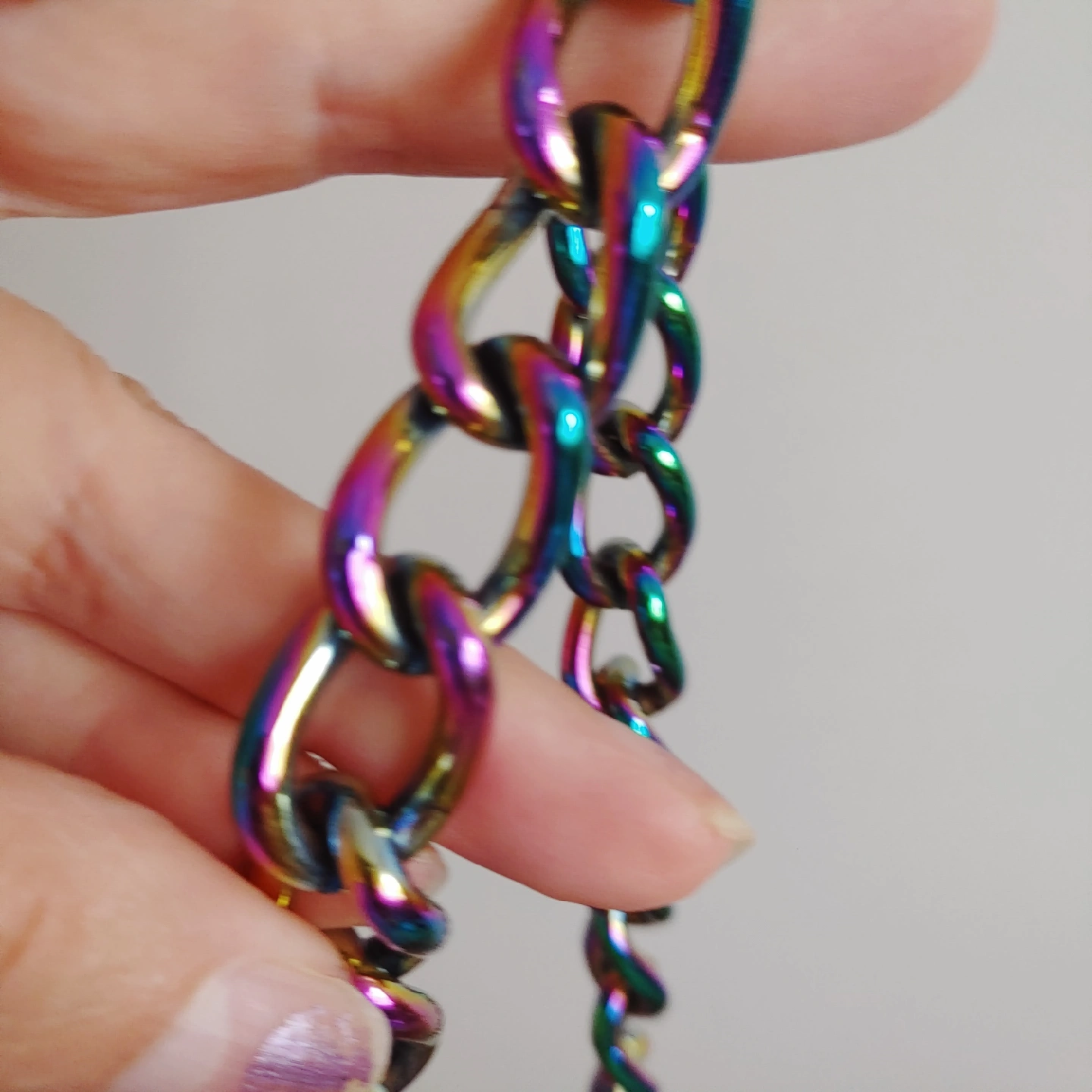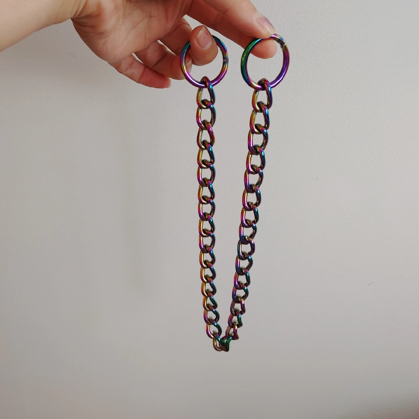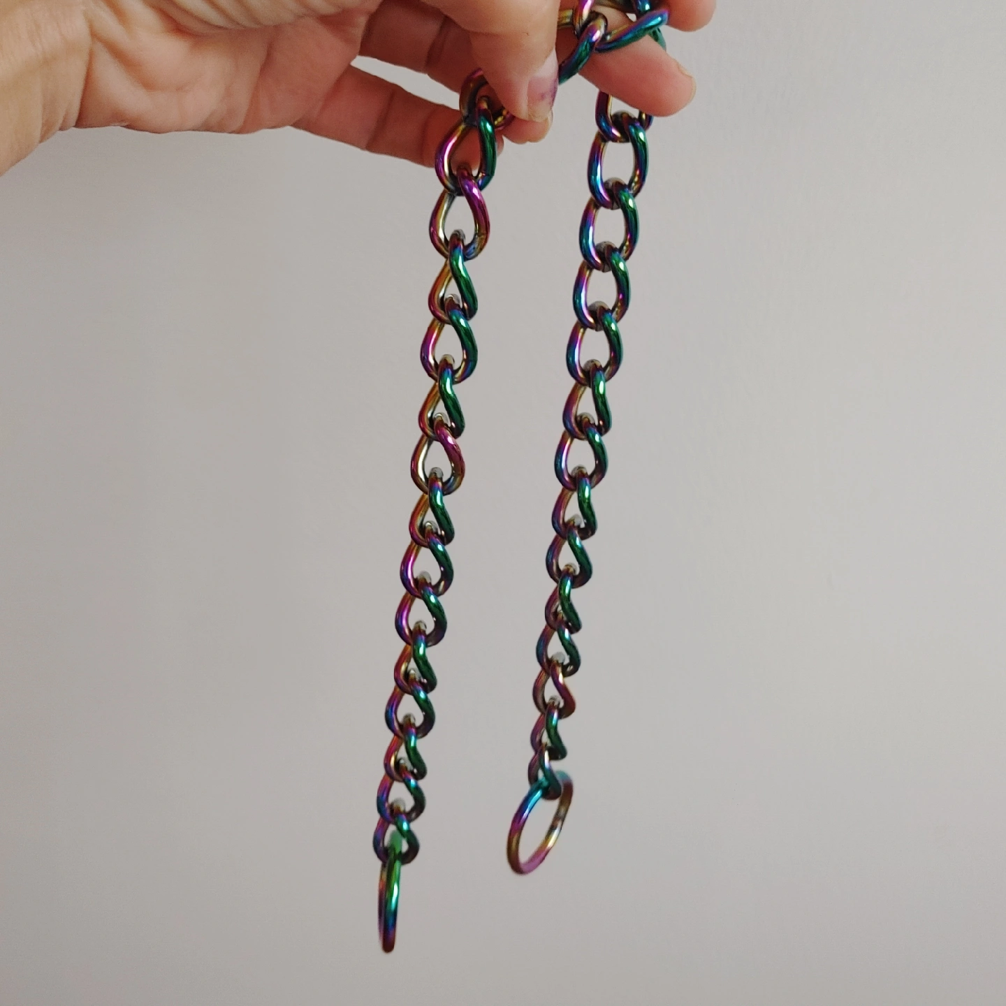This is a rainbow coloured metal chain. It's in great condition and has a really cool look. Perfect for adding a pop of colour to any outfit! 0.6" x. (23" long )