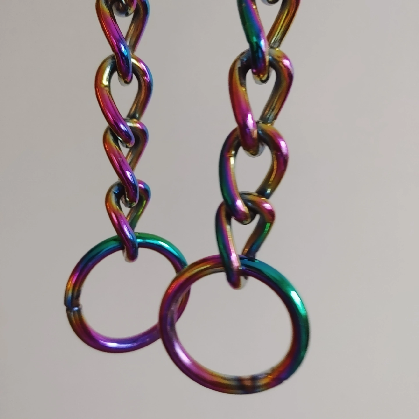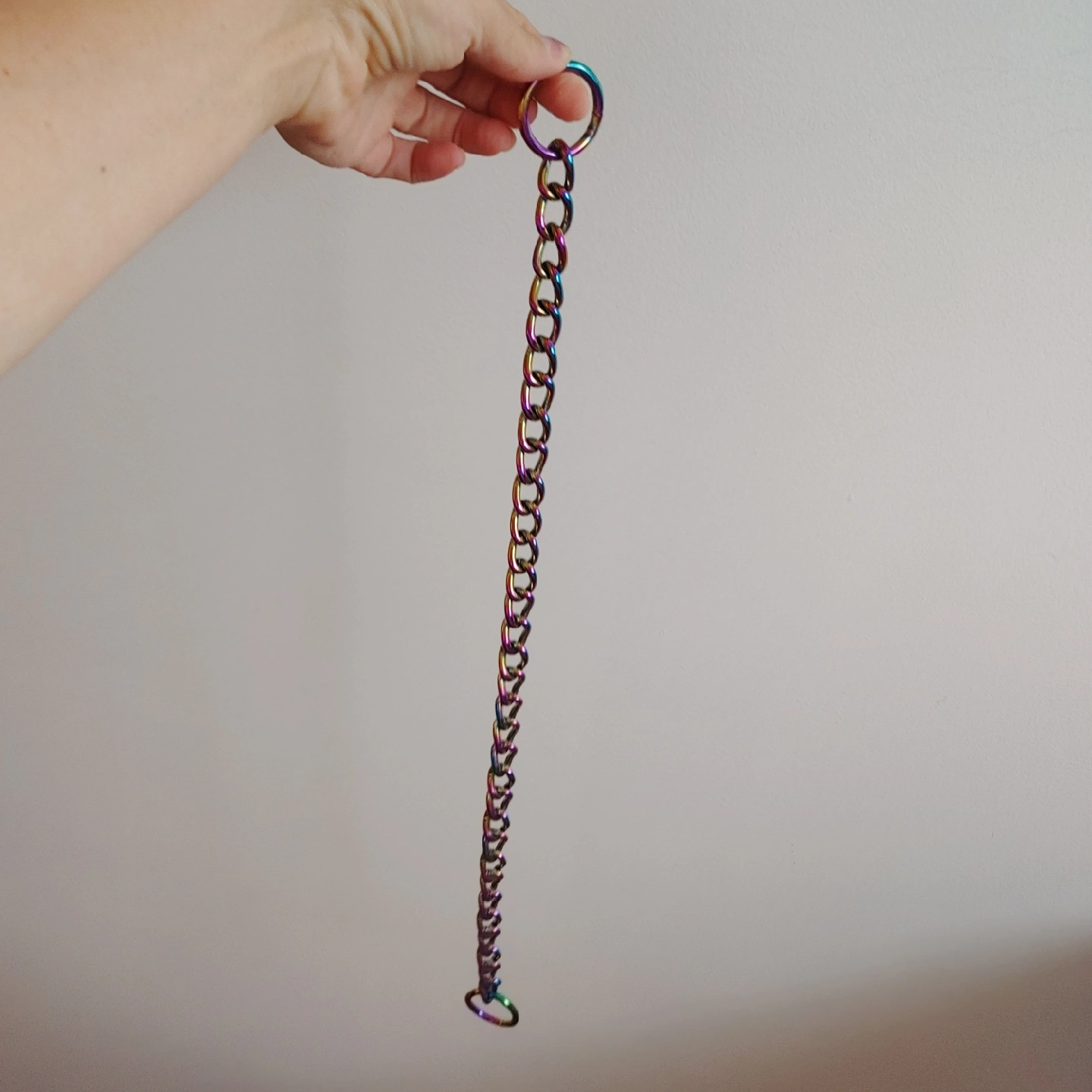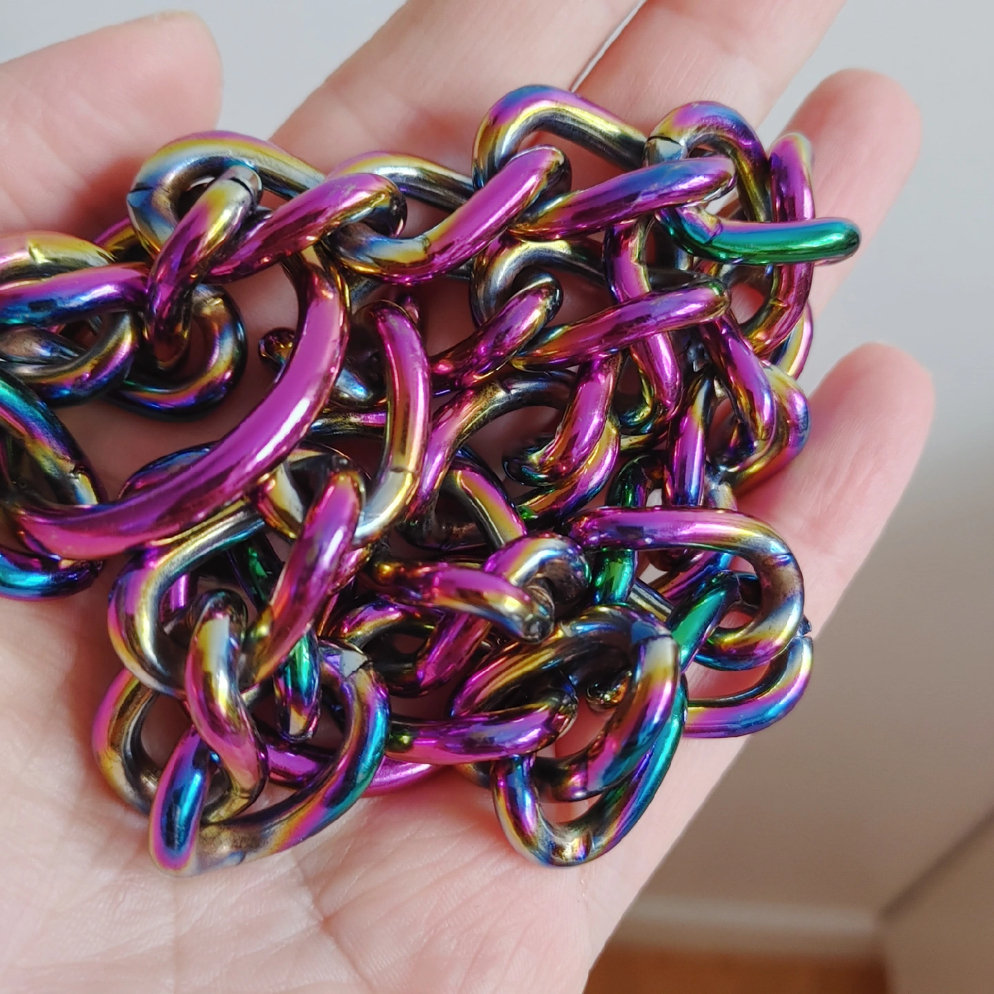 This is a rainbow coloured metal chain. It's in great condition and has a really cool look. Perfect for adding a pop of colour to any outfit! 0.6" x. (23" long )