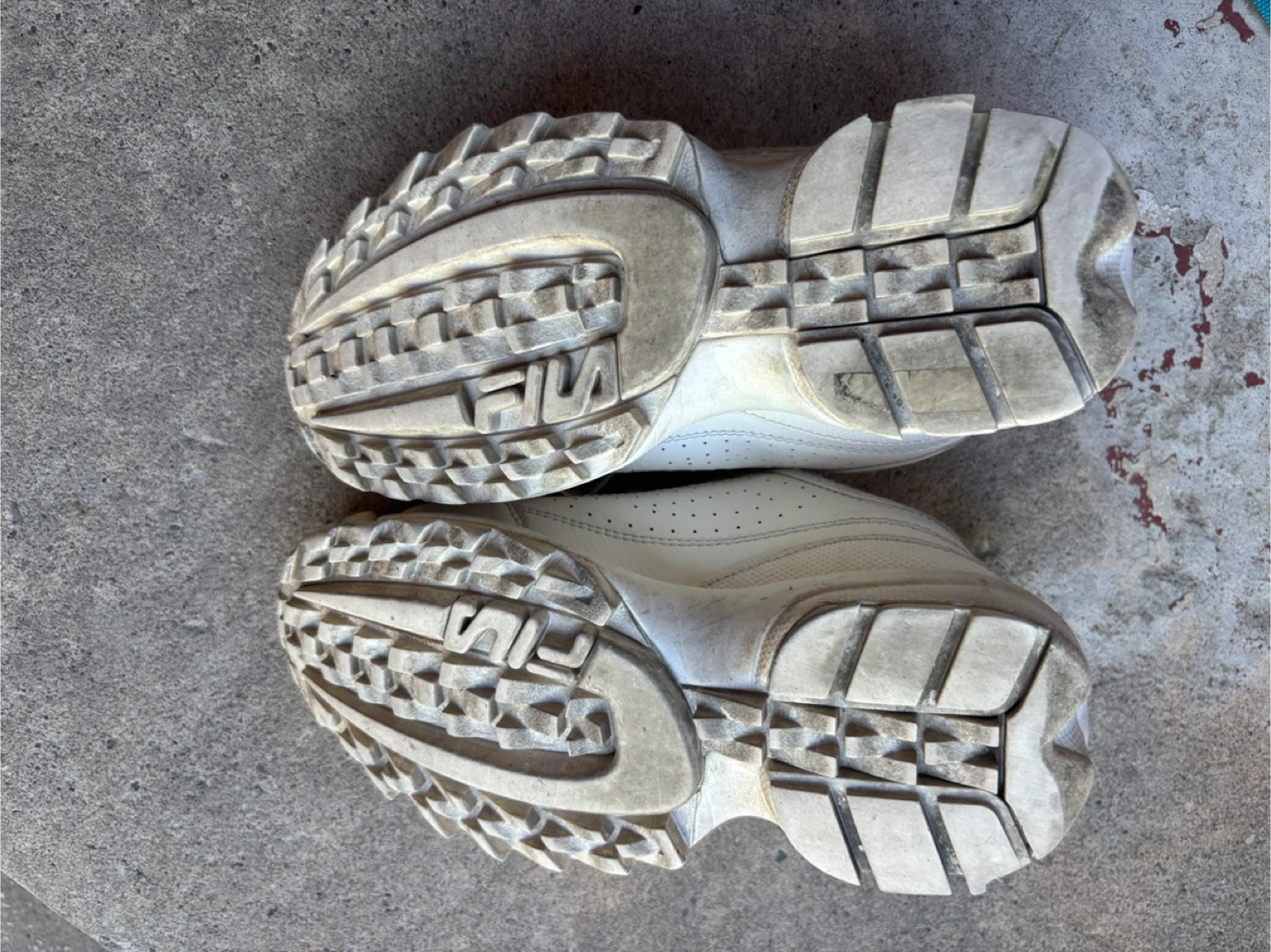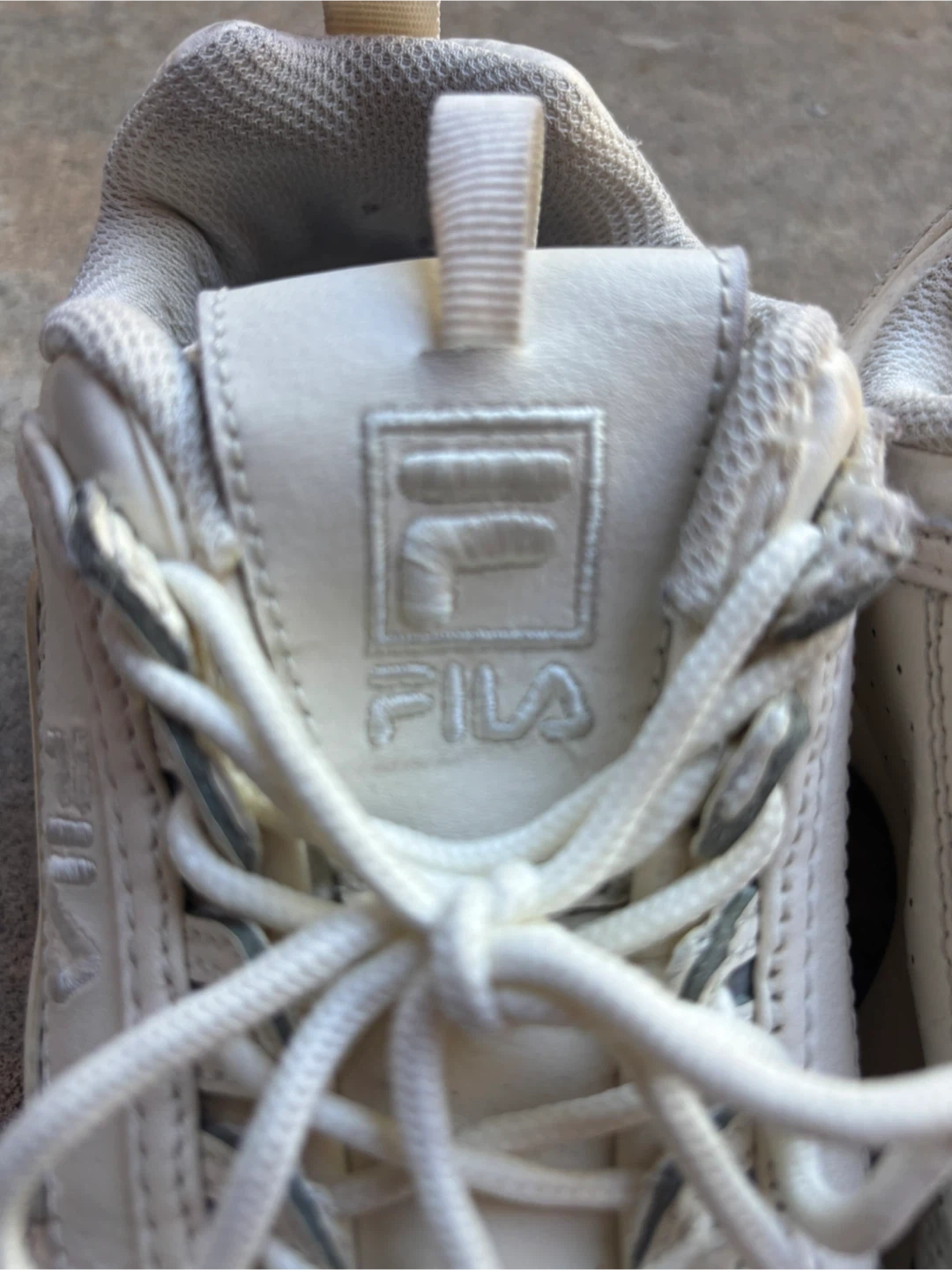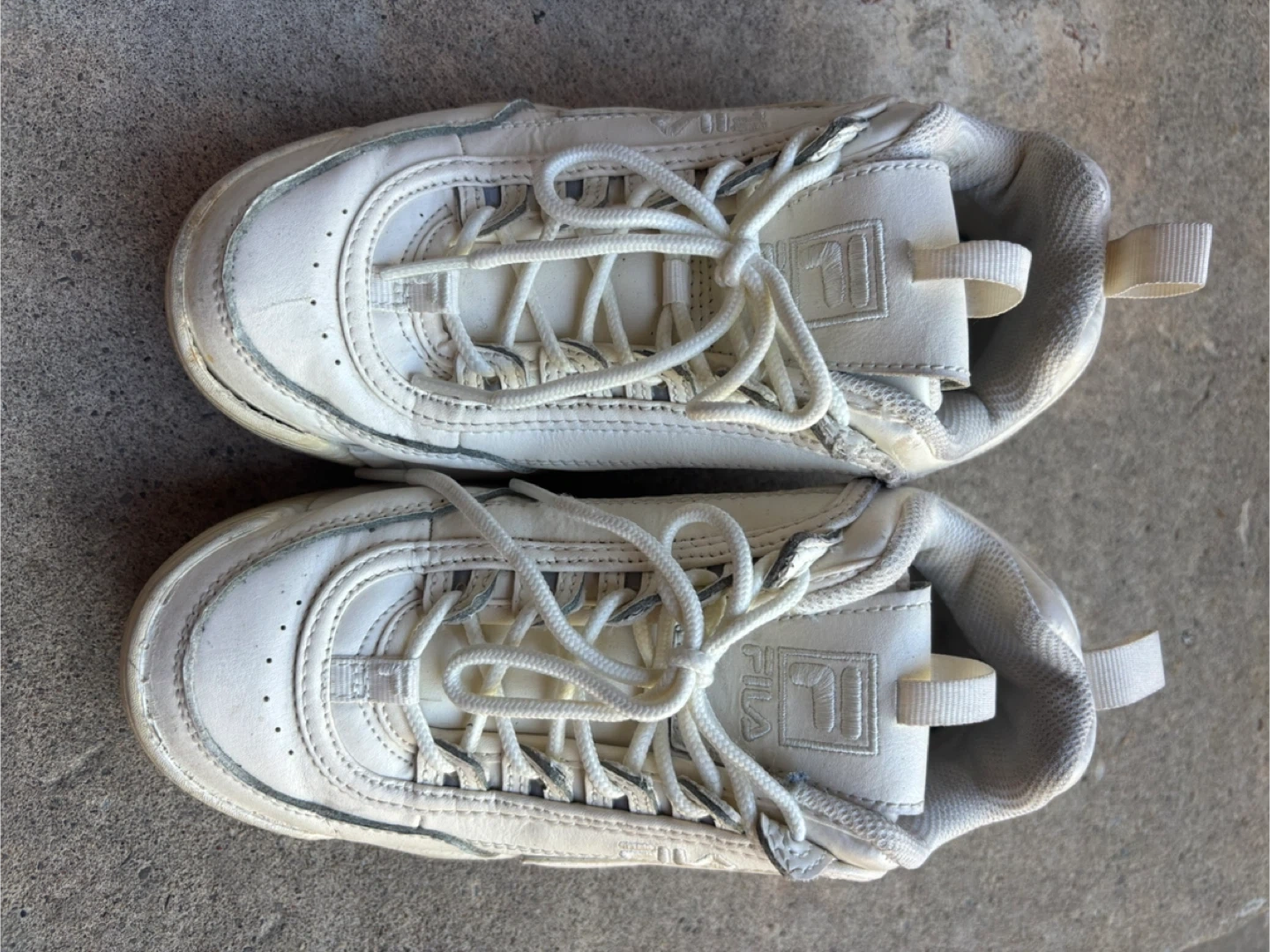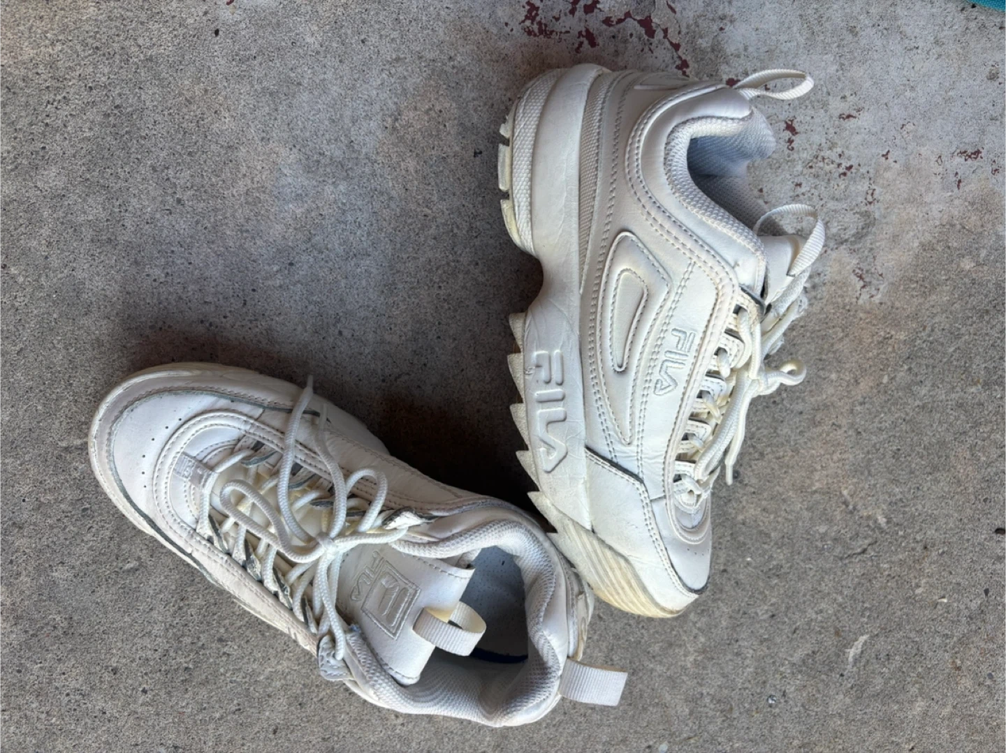 Selling a pair of Fila sneakers in white. They have some signs of wear, as you can see in the pictures, but still have lots of life left! Perfect for a casual, sporty look. Size 5 1/2