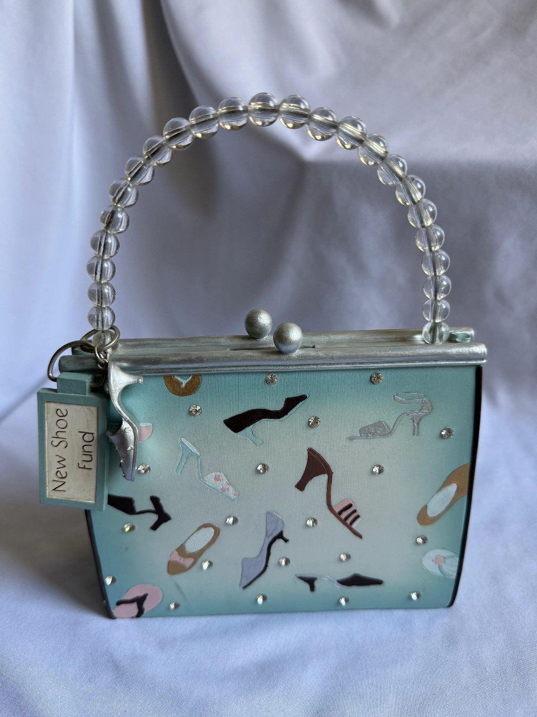 This is a cute "New Shoe Fund" coin bank purse by PurseNality Banks! It's a light blue colour with shoe designs and a beaded handle. Perfect for saving up for your next pair of shoes!
