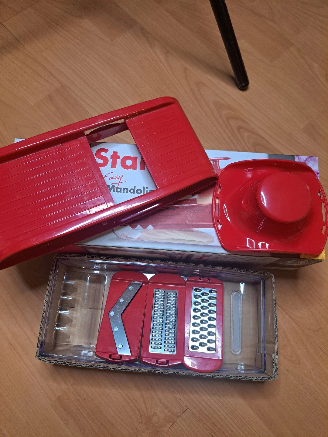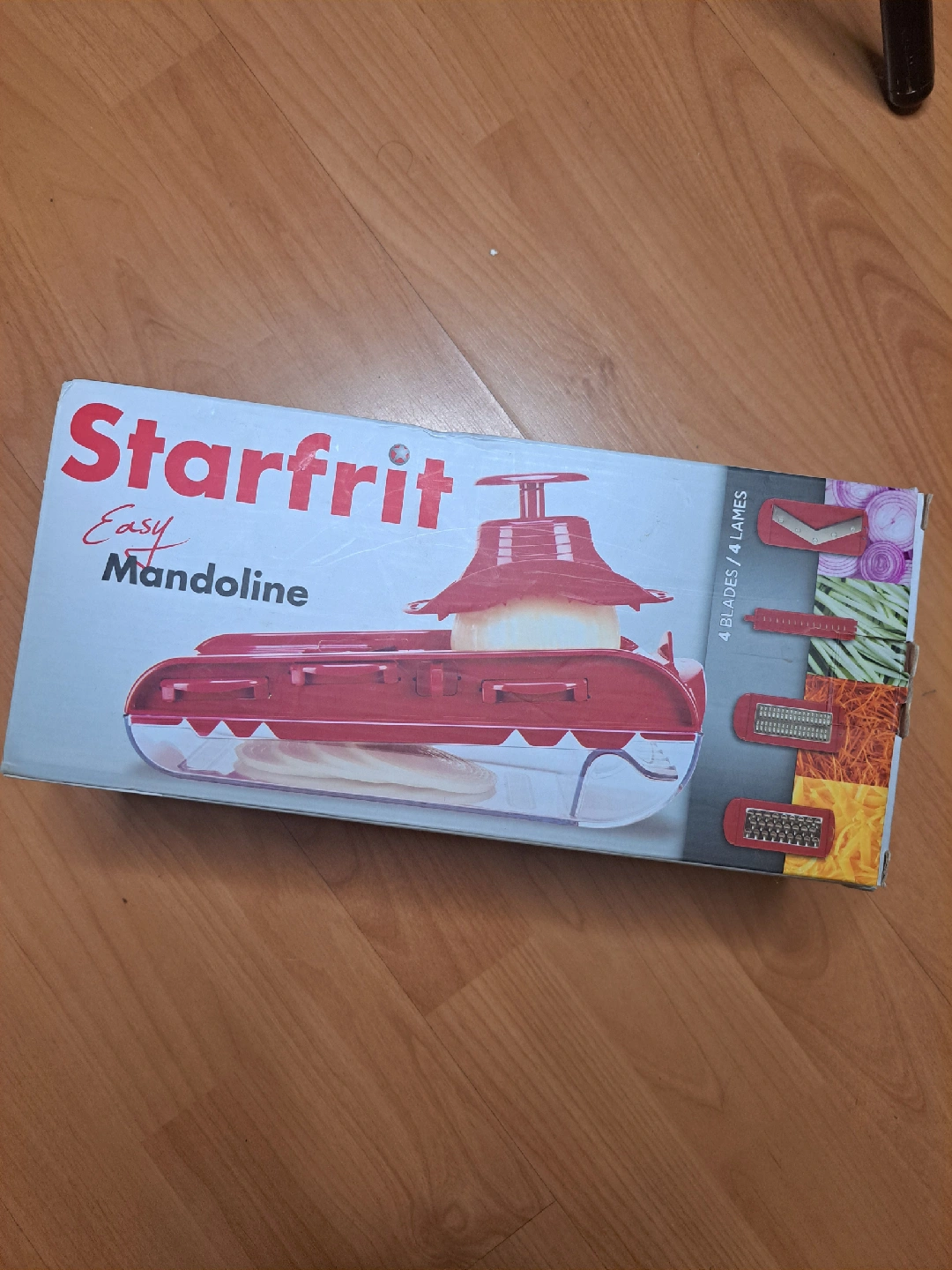 Selling a Starfrit Easy Mandoline slicer! It comes with 3 blades for different types of cuts. The box is included, and everything is in great shape!