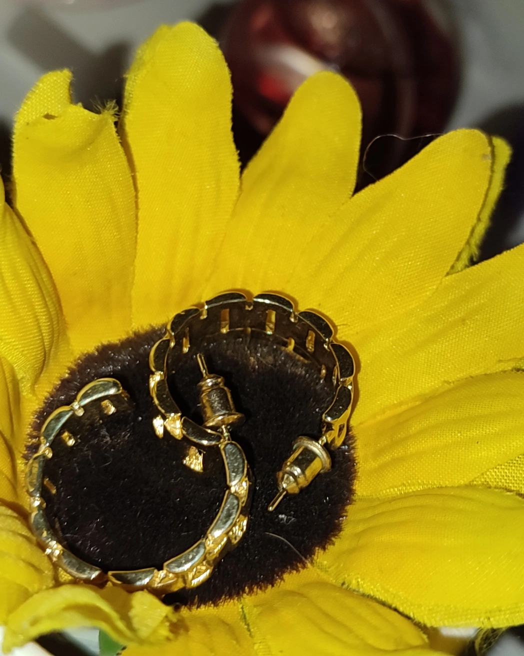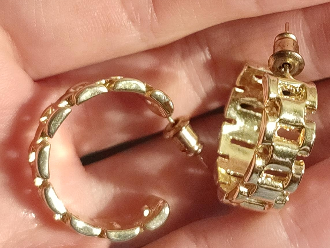 Selling these because I outgrown their style (faux chain and link) pair of gold plated hoop earrings. They're in good condition and ready for a new home