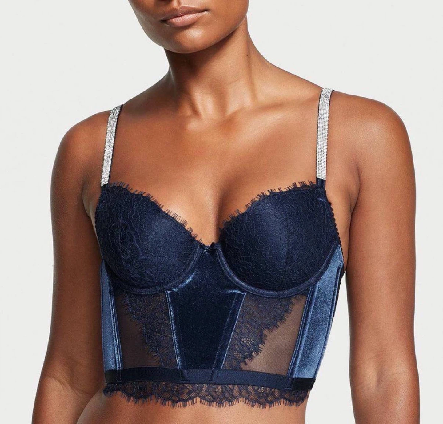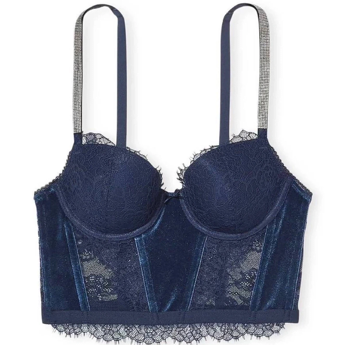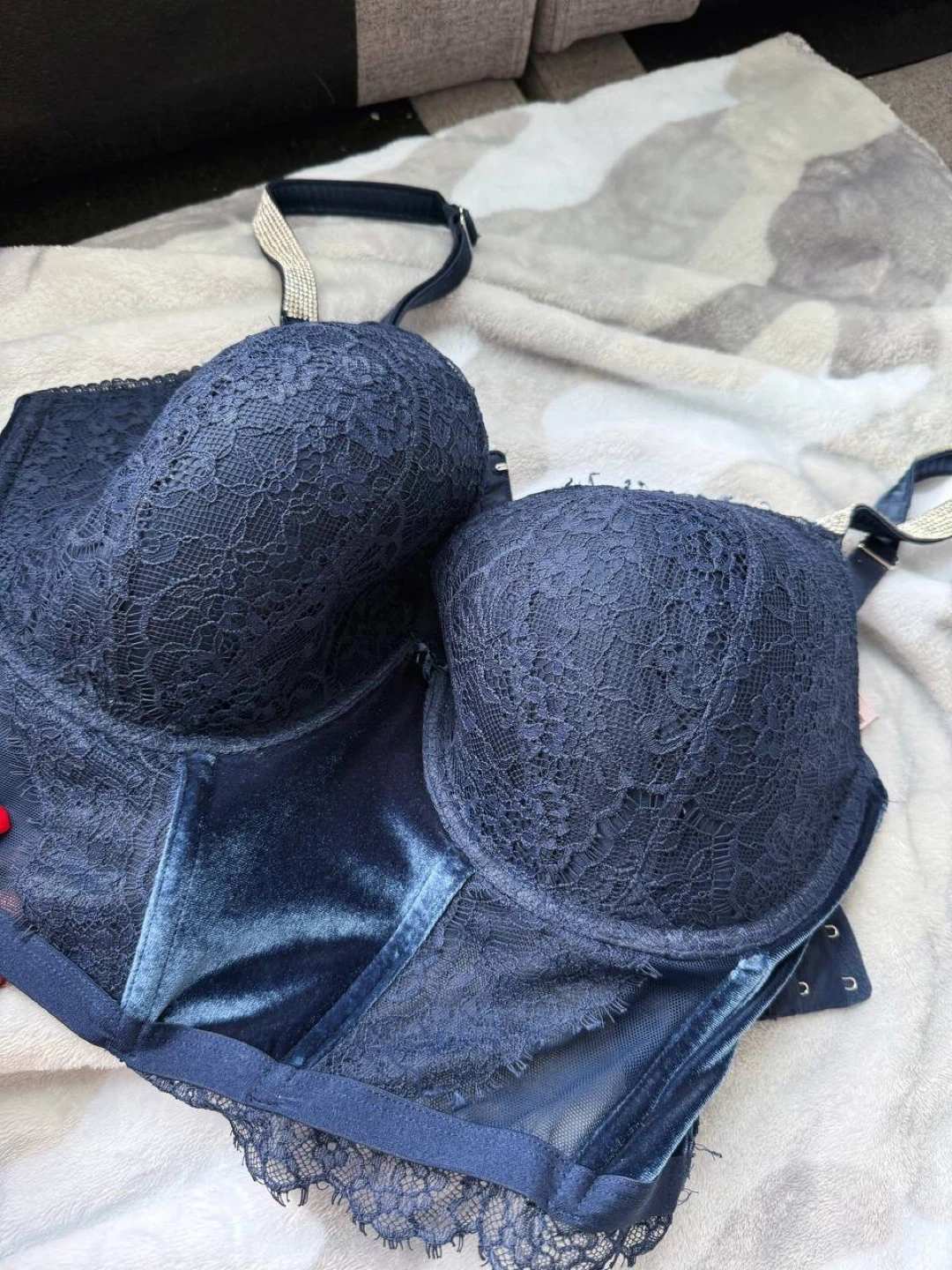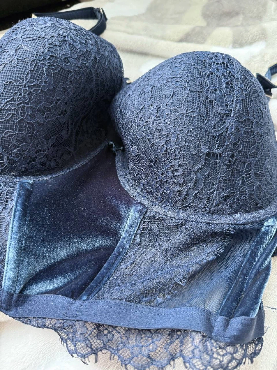 ✨ Decluttering ✨ Affordable prices, quick pick up. 📍 St. George / Sheppard West / Victoria Park ✅Description: Pre-loved item in perfect condition No issues or damages Navy blue velvet corset bra. Features delicate lace detailing and rhinestone-embellished straps. Worn 2 times, excellent condition. 38DD