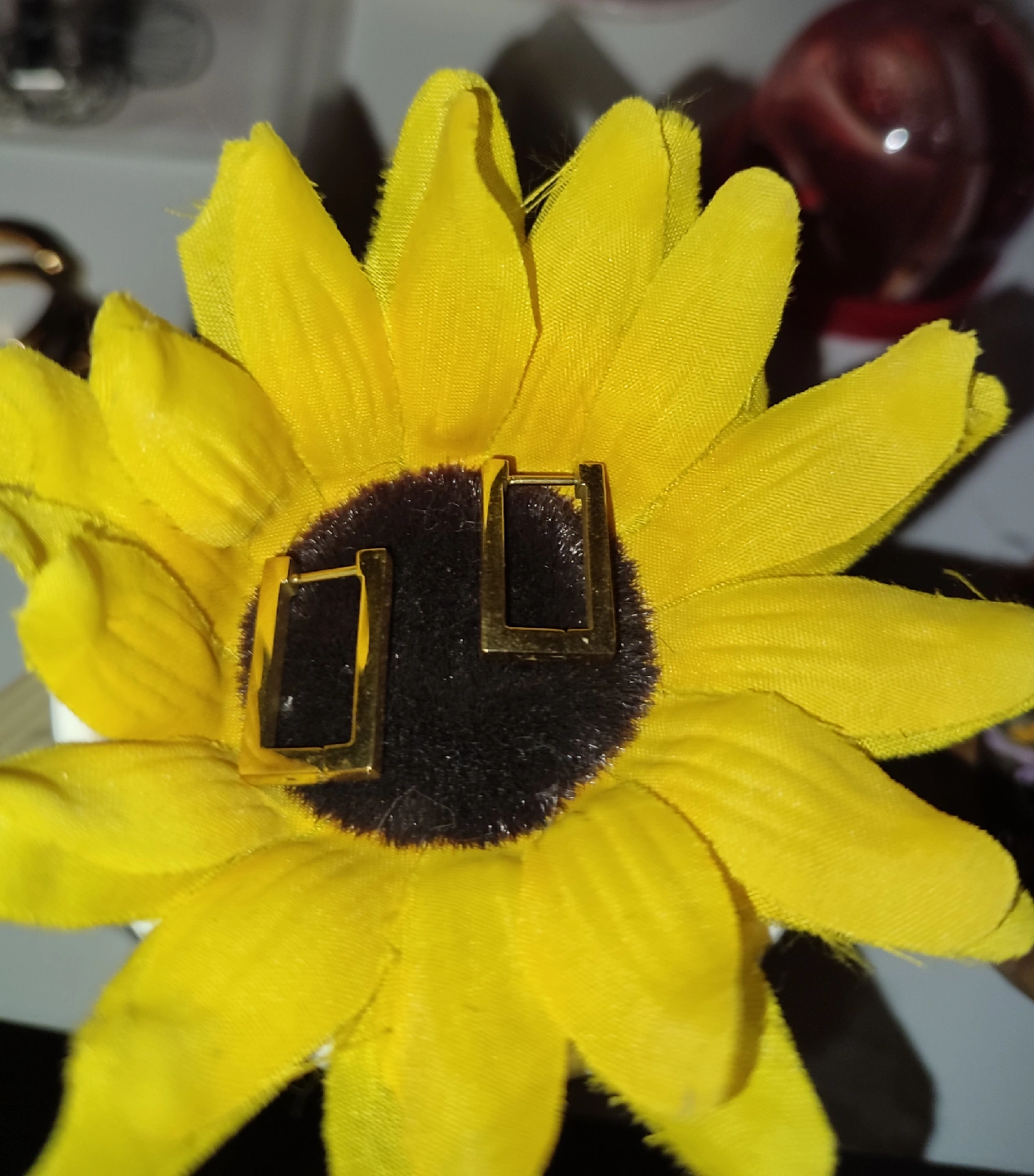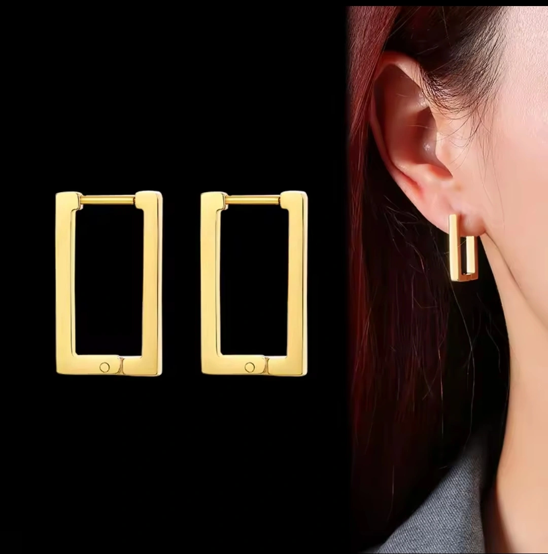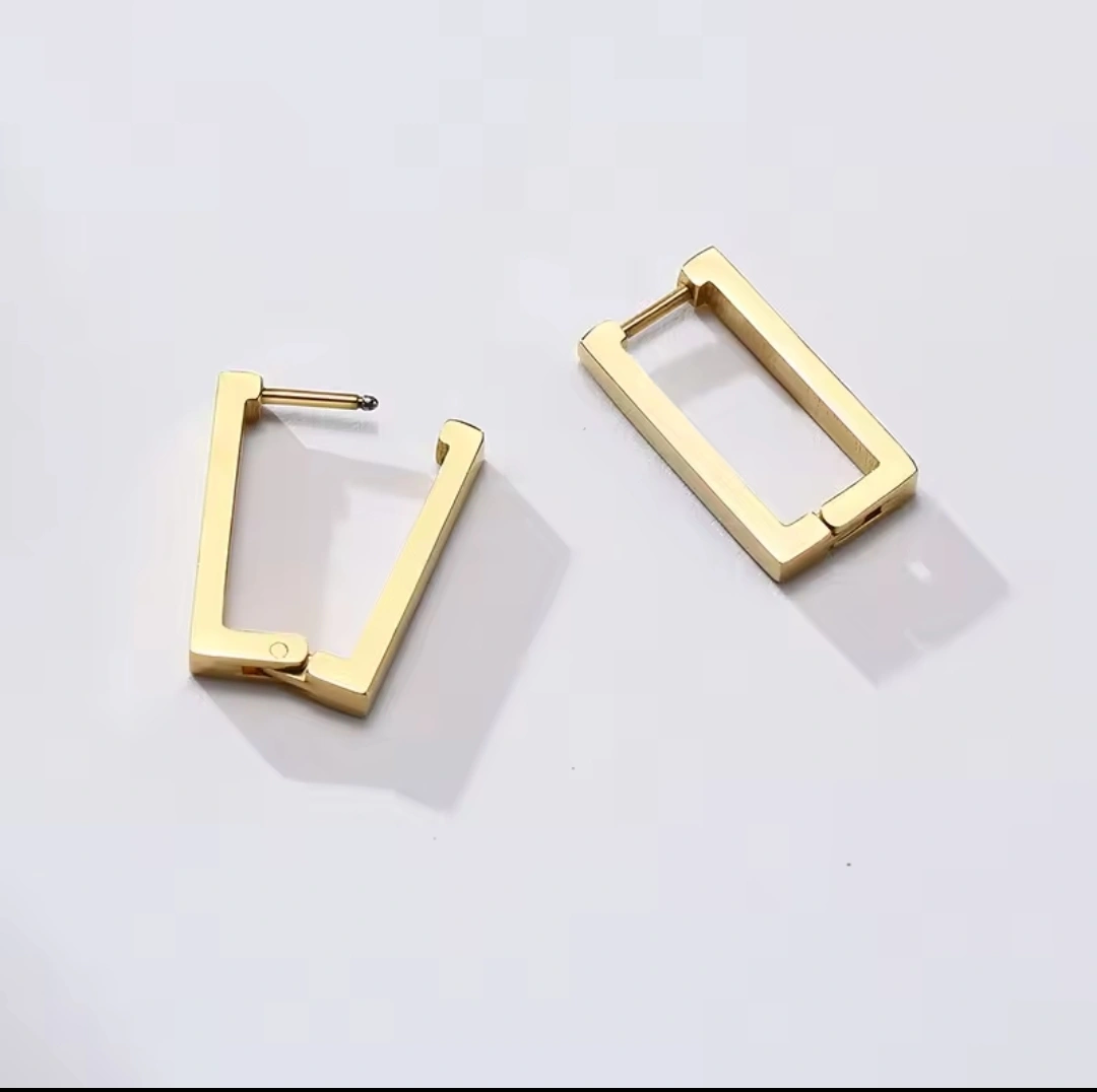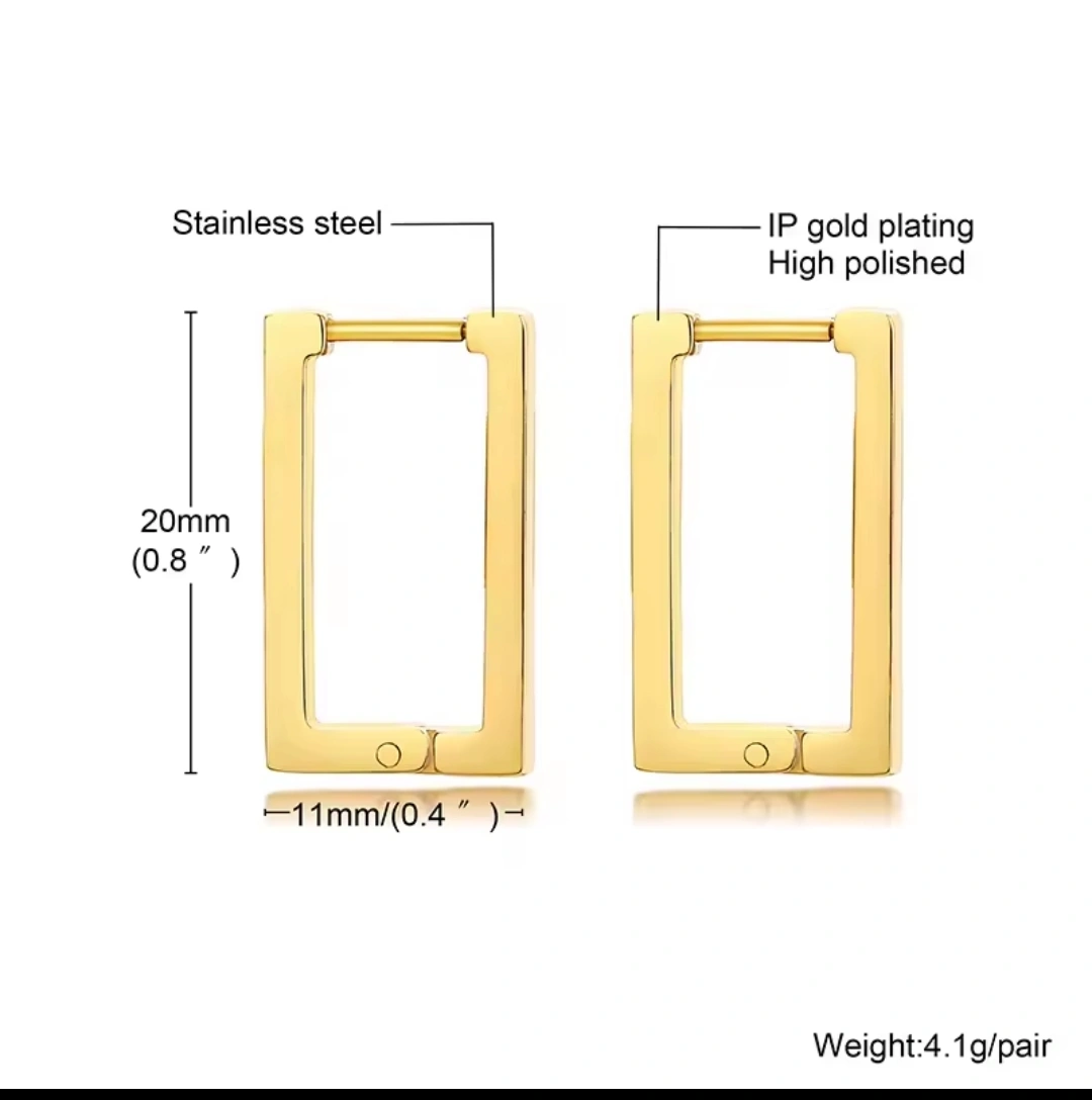 Selling a pair of gold plated rectangular hoop earrings. Each earring is 20mm (0.8") in length and 11mm (0.4") in width. They weigh 4.1g per pair. Never worn out, didn't like on me