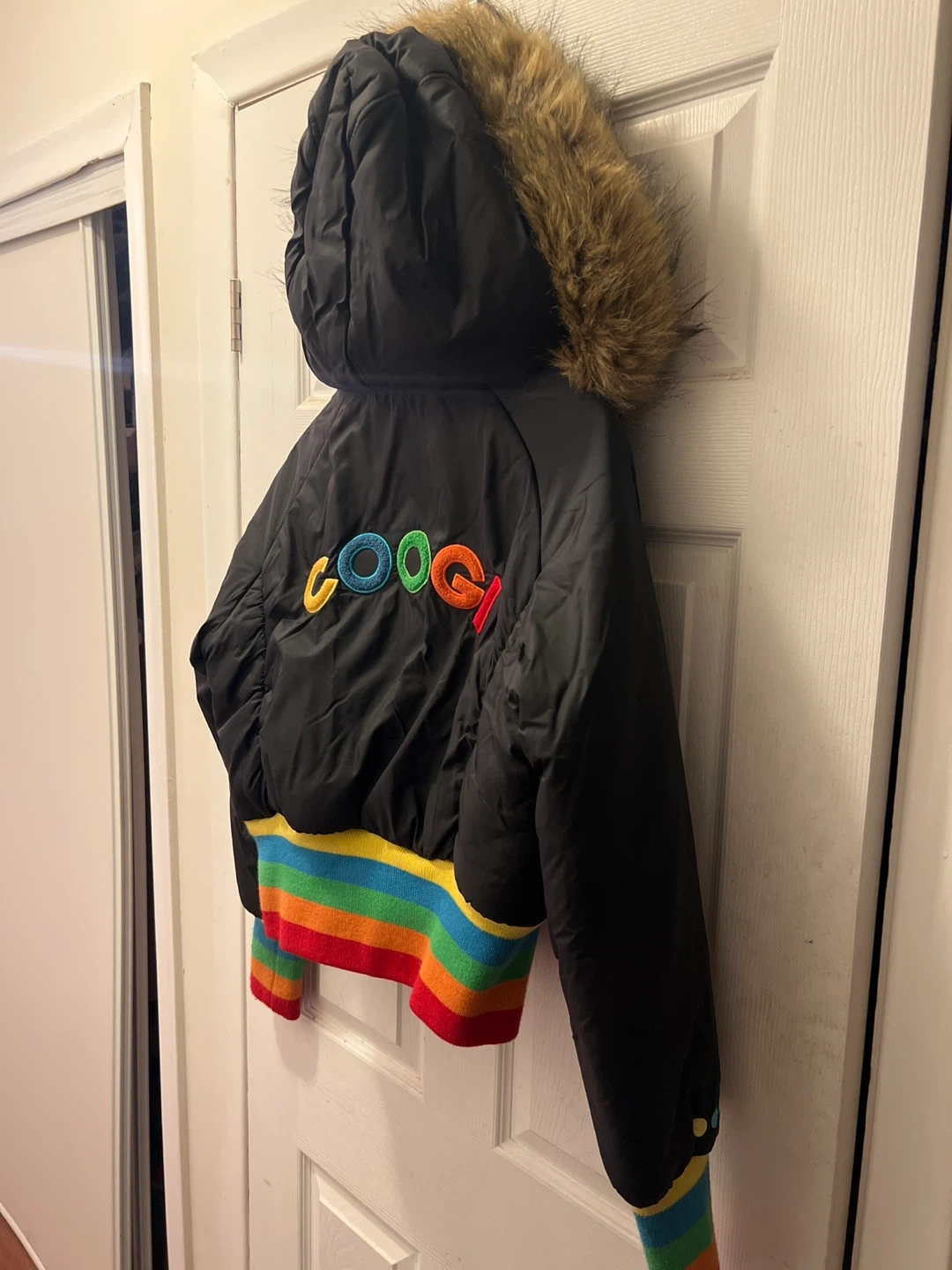 Selling a COOGI puffer jacket in black! It has a hood with fur trim and the COOGI logo embroidered on the chest. The cuffs and hem feature a colourful striped pattern. It's in great condition and perfect for staying warm and stylish!