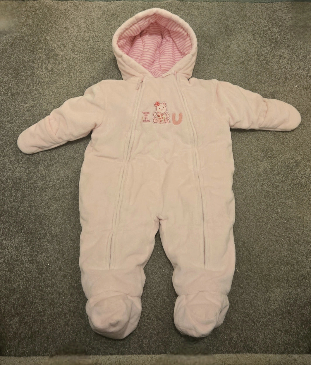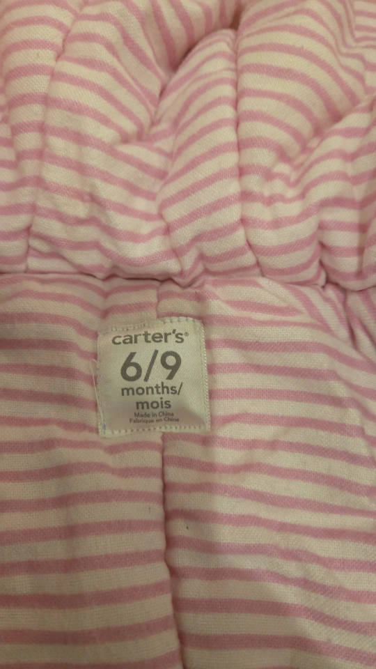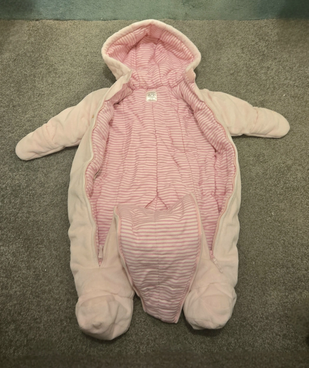Snuggly and warm Carter's snowsuit for your little one! This cute pink snowsuit is in excellent condition and perfect for keeping your baby cozy during the colder months. It's size 6-9 months and features a hood, covered hands and footed design. Pink baby coat for 6-9 months old.