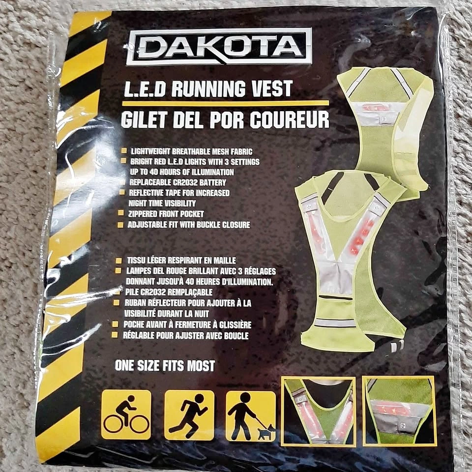 L.E.D. Running Vest. One size fits most. Details in attached photo. New. Asking $10.00. Pick up in Leduc.