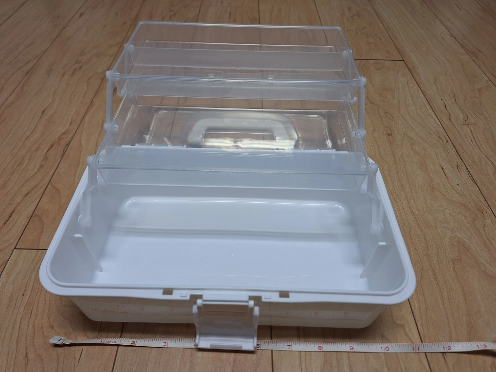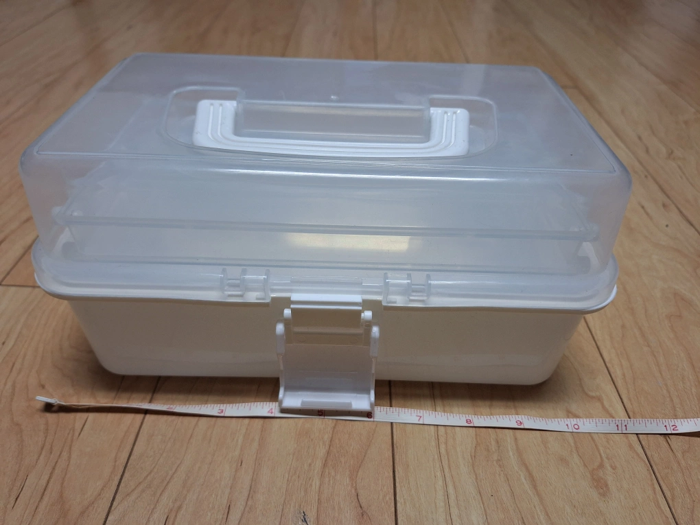Here's a handy clear plastic storage box! It's great for organizing all sorts of things. It has a handle on top for easy carrying and a secure latch to keep everything inside safe and sound. Two fold out levels. Hardly used. Measures about 10" x 5" x 5".