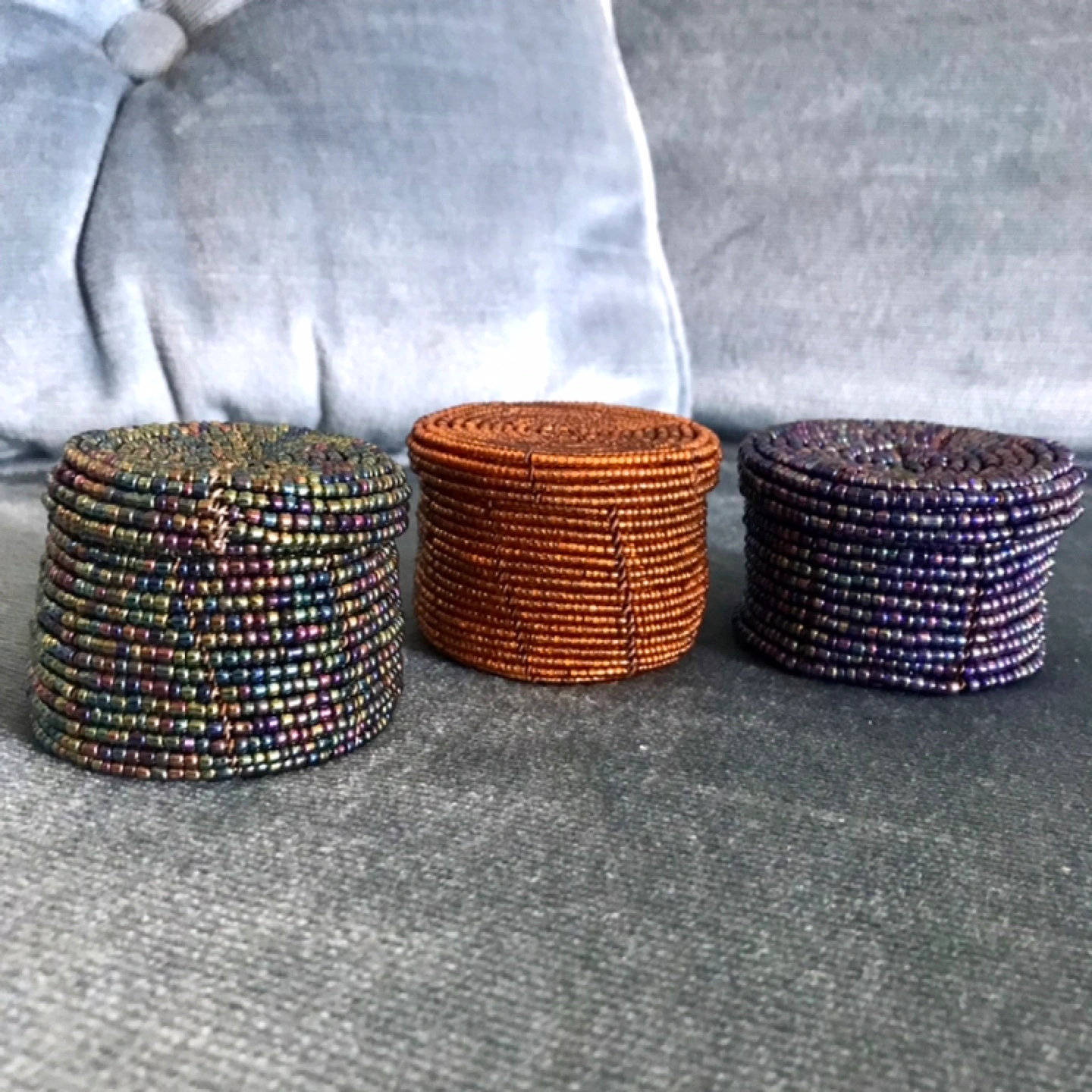 Lovely set of Beaded ‘boxes’ in an organic circular shape. 2.5” W x 1.5” H In 3 beautiful, glimmering jewel tones. Each comes with a matching lid. Elegant holders for various jewelry like earrings, pendants, rings. Or be creative and hide little stationery, candy, or any Accessories.