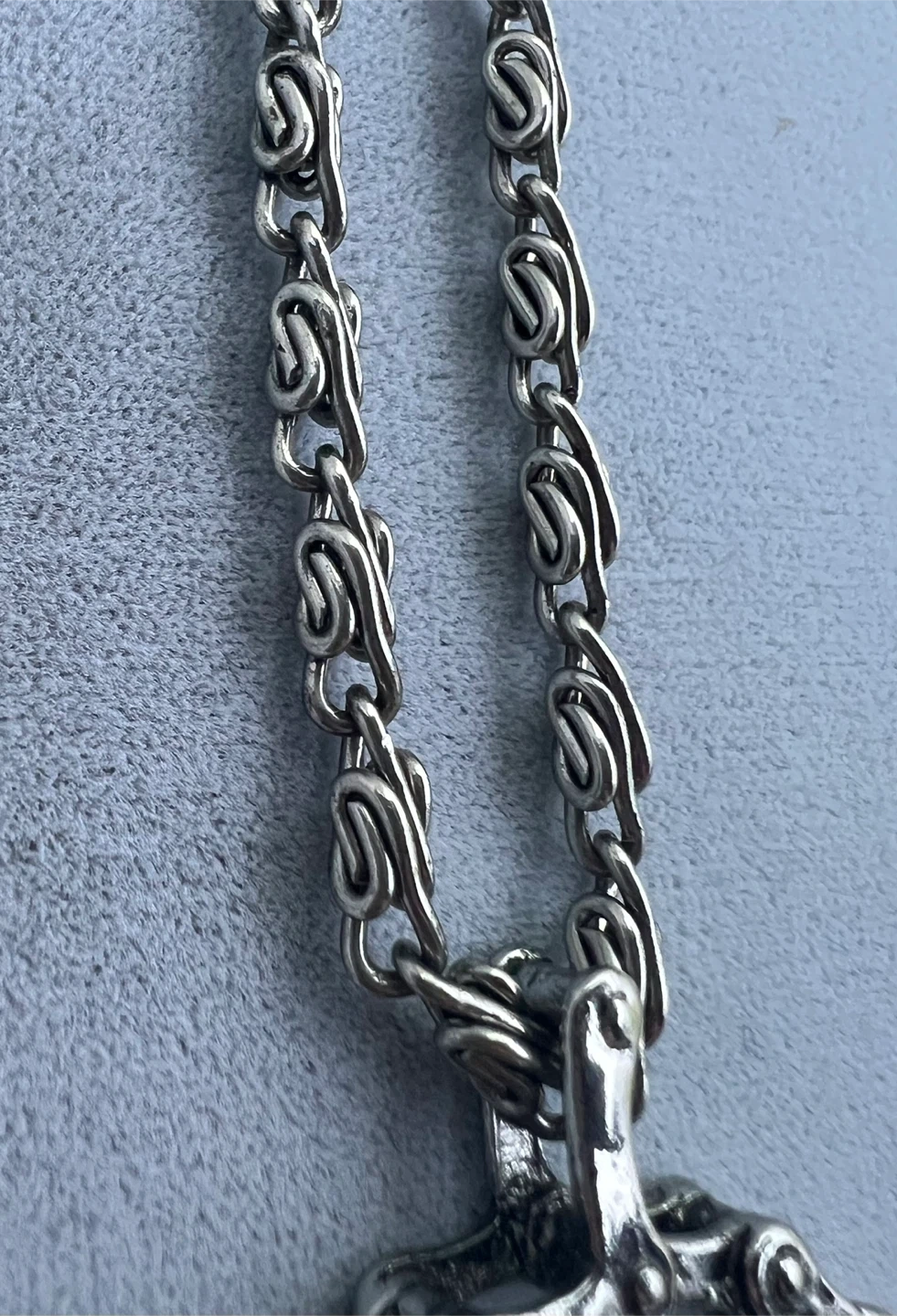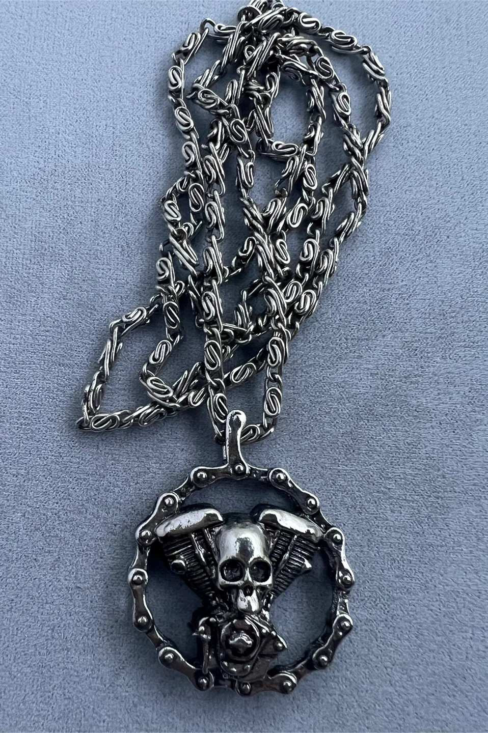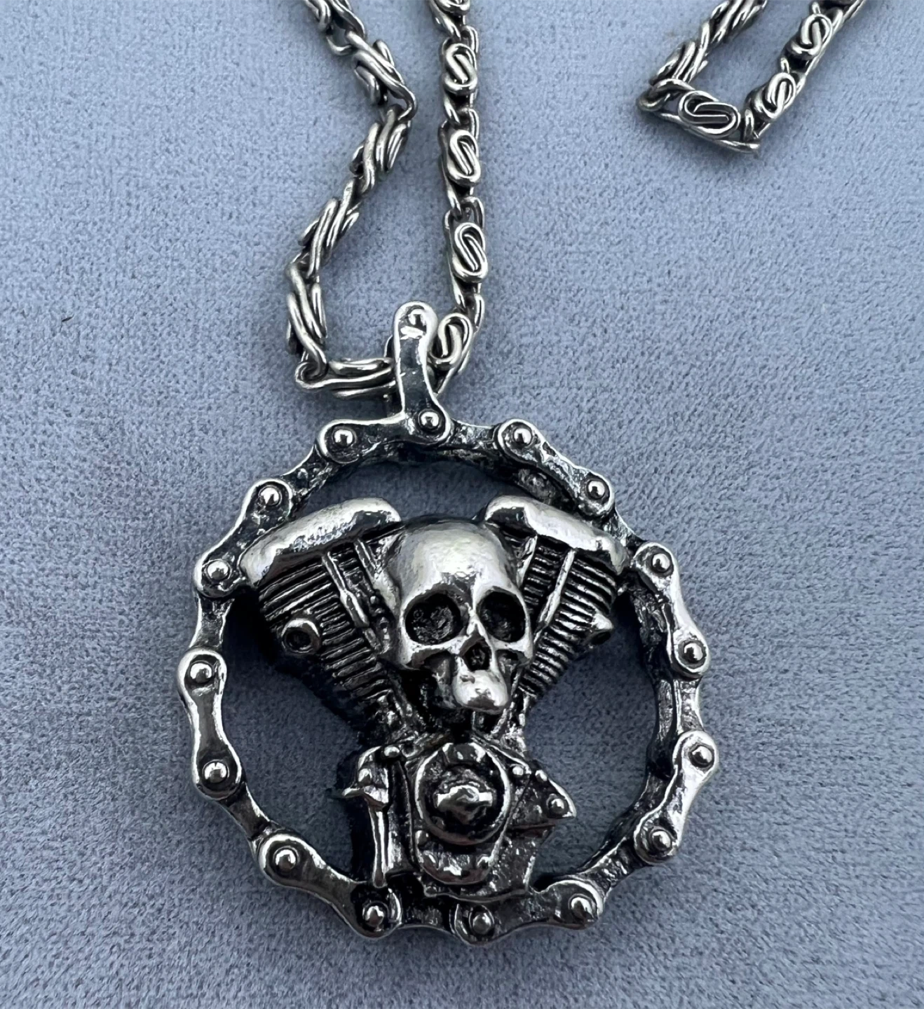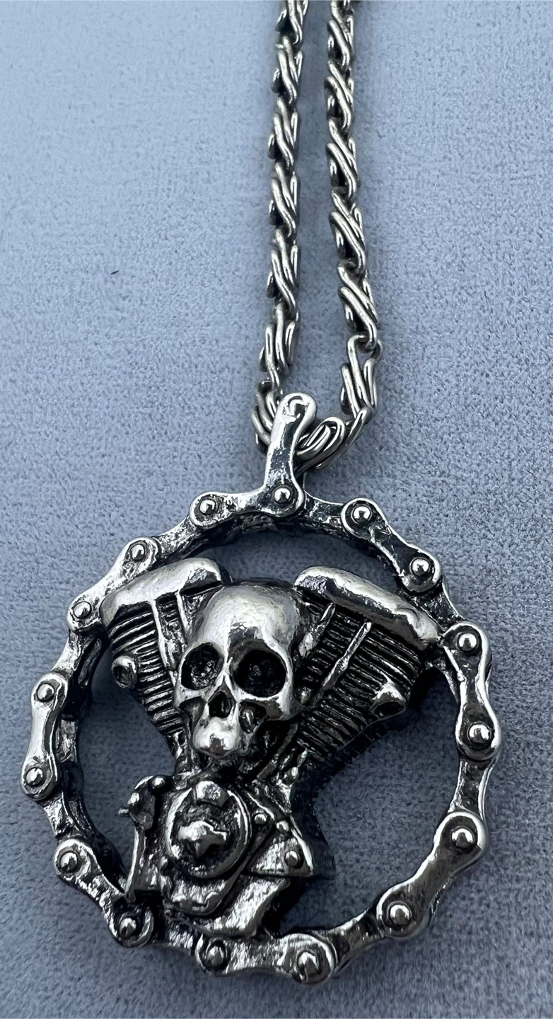 This edgy piece features a skull set against a detailed motorcycle engine, encircled by a chain-link border Attached to a long chain Preloved but in great condition A statement piece that combines toughness and fashion!! Asking $20 Interested? Message me and please check my other listings…
